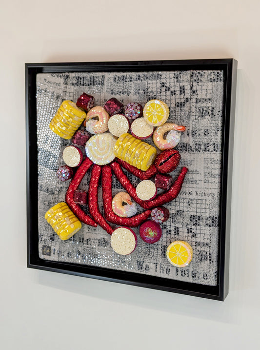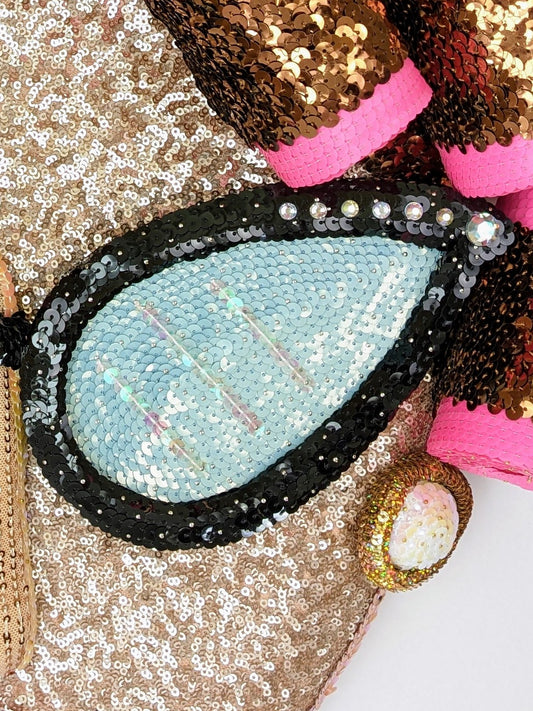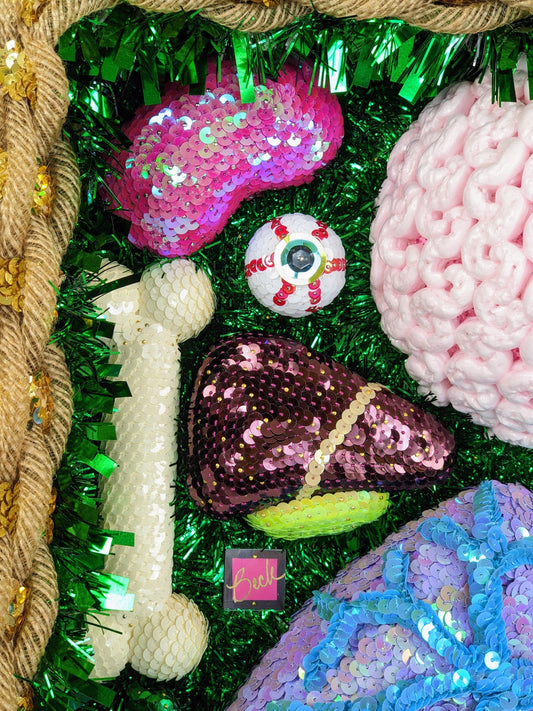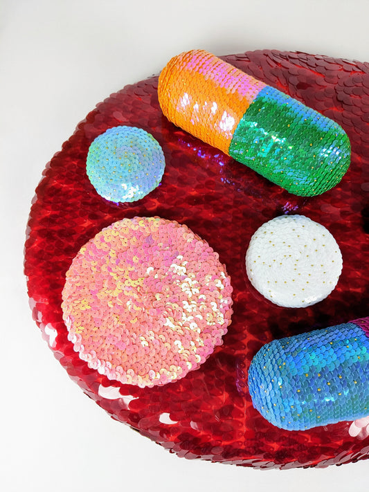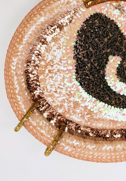 Sequins have been Beck’s primary medium since 2020. As a self-taught artist, she was inspired by a mid-century craft where styrofoam fruits or ornaments were covered with sequins and beads that were pinned in place. In Beck’s artwork, the styrofoam understructure is carved and painted, and then a variety of sequined fabrics, trims, and loose sequins are glued and pinned down. She often incorporates garbage styrofoam and thrifted sequined clothes into her work whenever possible. This mix of materials gives her the freedom to make anything that comes to mind.