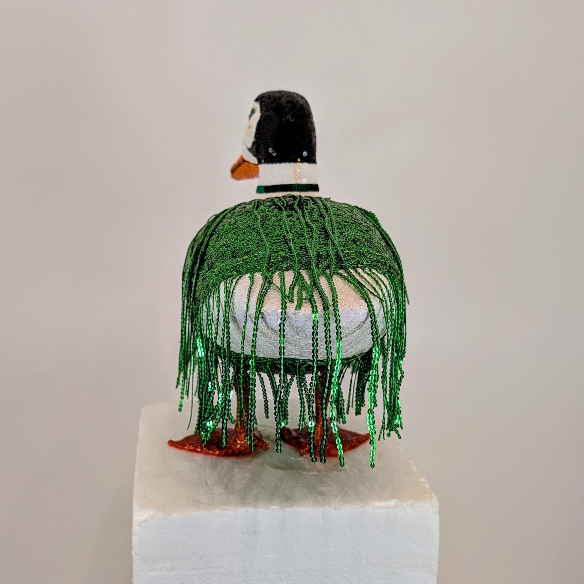 Art Deco Duck was inspired by Cyd Charisse's character in the film, "Singing in the Rain." Her kelly green sequin dress is swinging with fringe, and the neckline is decorated with a pattern of blue and green sequins in a variety of shapes and sizes. Her black hair is in a short bob that curls under her cheek. Her orange feet are glittered and resined to retain their sparkles. Her beak is sequined orange with red lipstick sequins.
