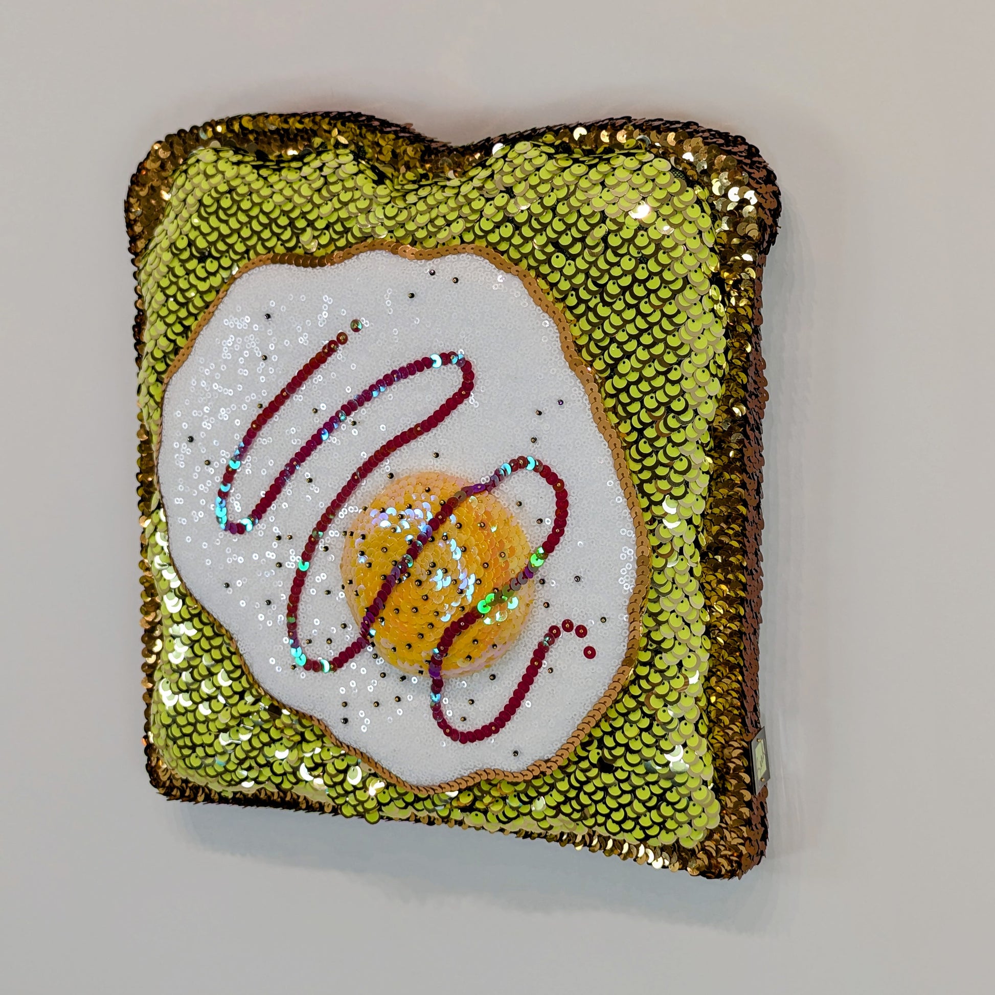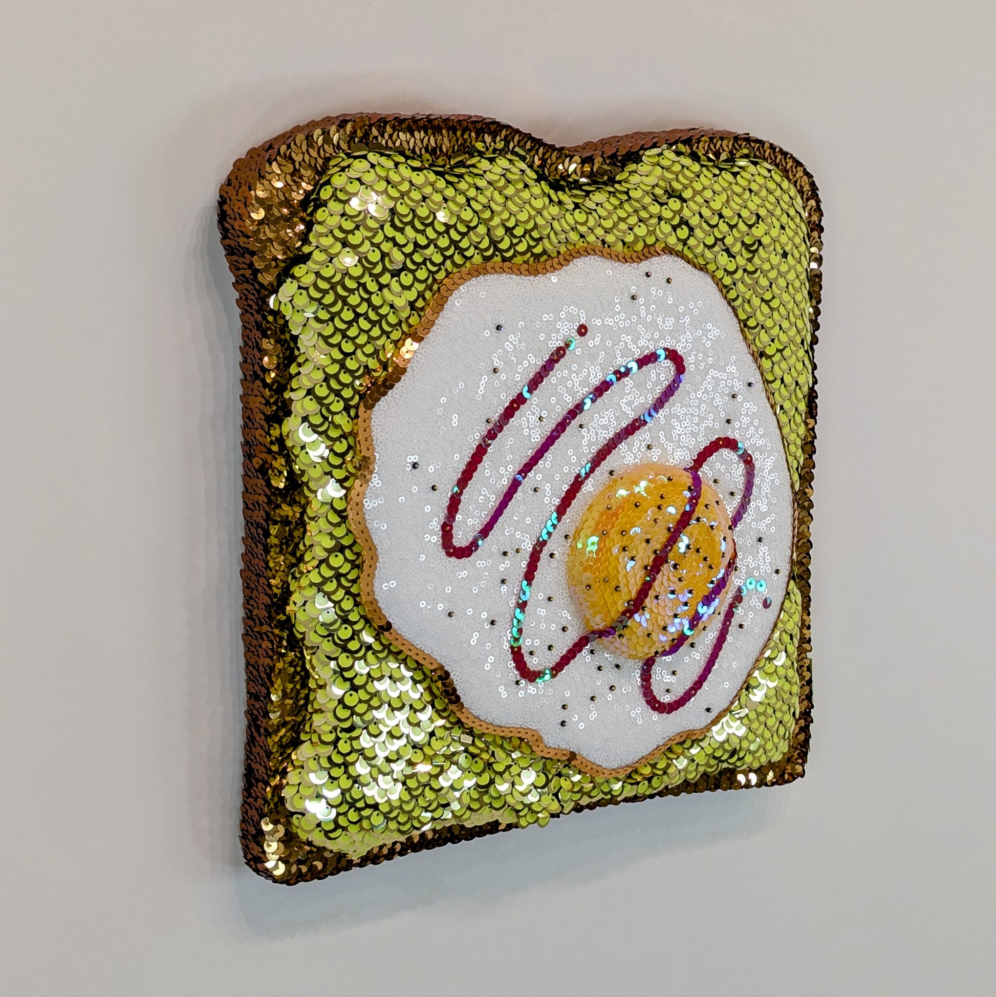 "Avocado Toast" is a 3D custom wall sculpture that features one of my favorite meals, avocado on toast with an egg. The red sauce can be hot sauce or ketchup, depending on your preference, and has a scattering of black pepper beads. This was originally a series of five different toast sculptures, but 2/5 is the last one left. It's the perfect size for a kitchen or brunch lover.