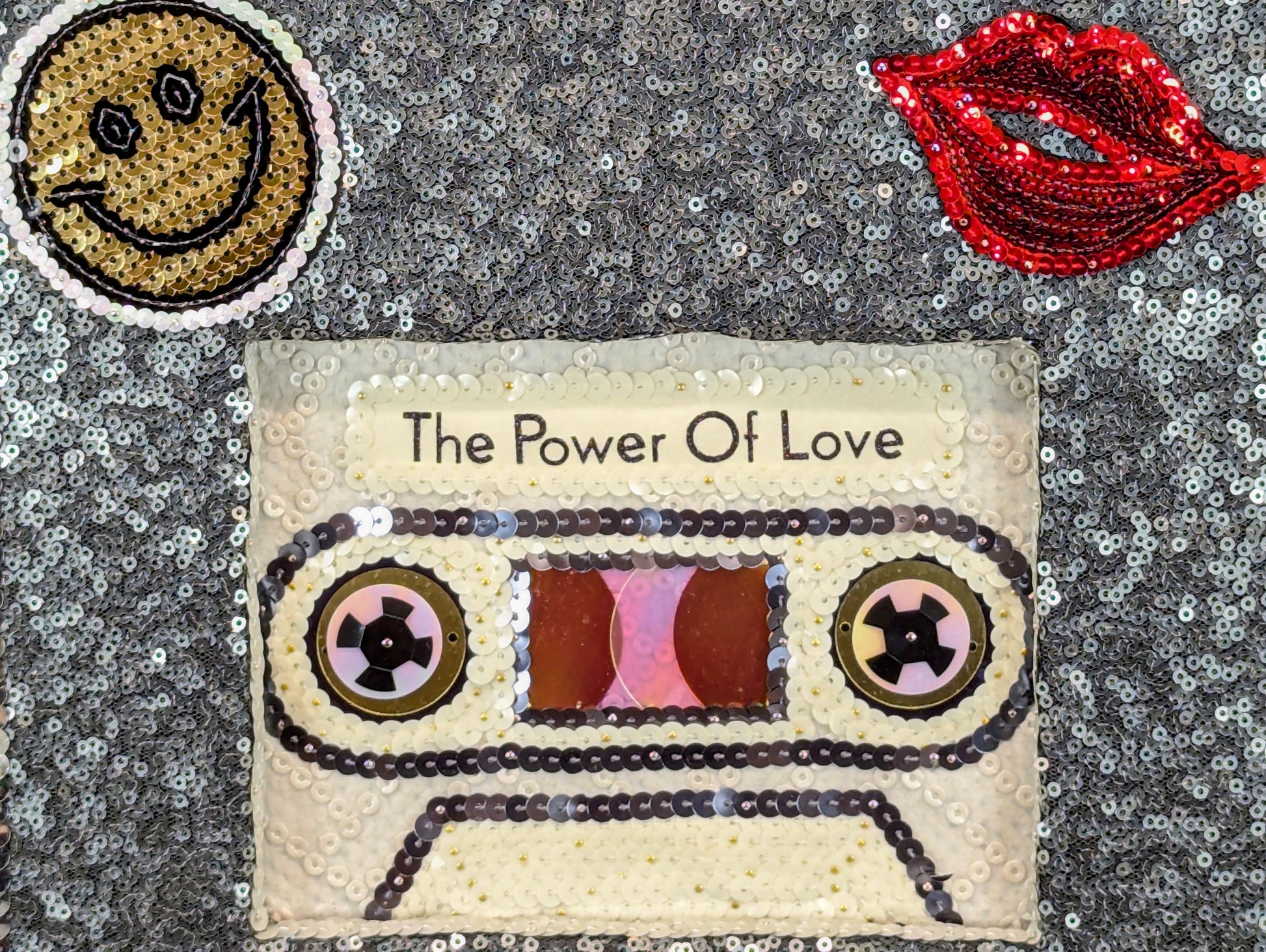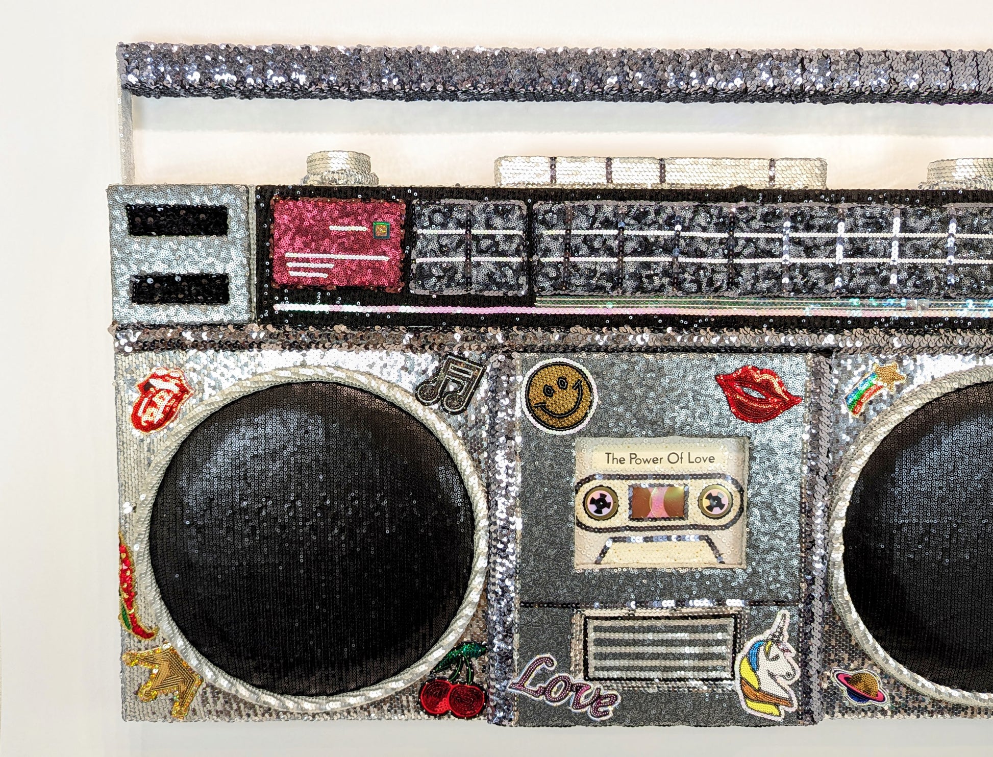 "Big Bada Boombox" is definitely the biggest sequined boombox I've ever made. Modeled on the exact boombox I received in 1985 for my birthday, it has one major difference; my father would have killed me if I put stickers all over it, but adult me can do whatever I want. Sequined stickers are everywhere, and so much fun. The tape in the deck is "The Power of Love" by Huey Lewis and the News, and it was a top 10 song that year. I remember it being in the first "Back to the Future" movie. Ahhh, those were the good old days.
