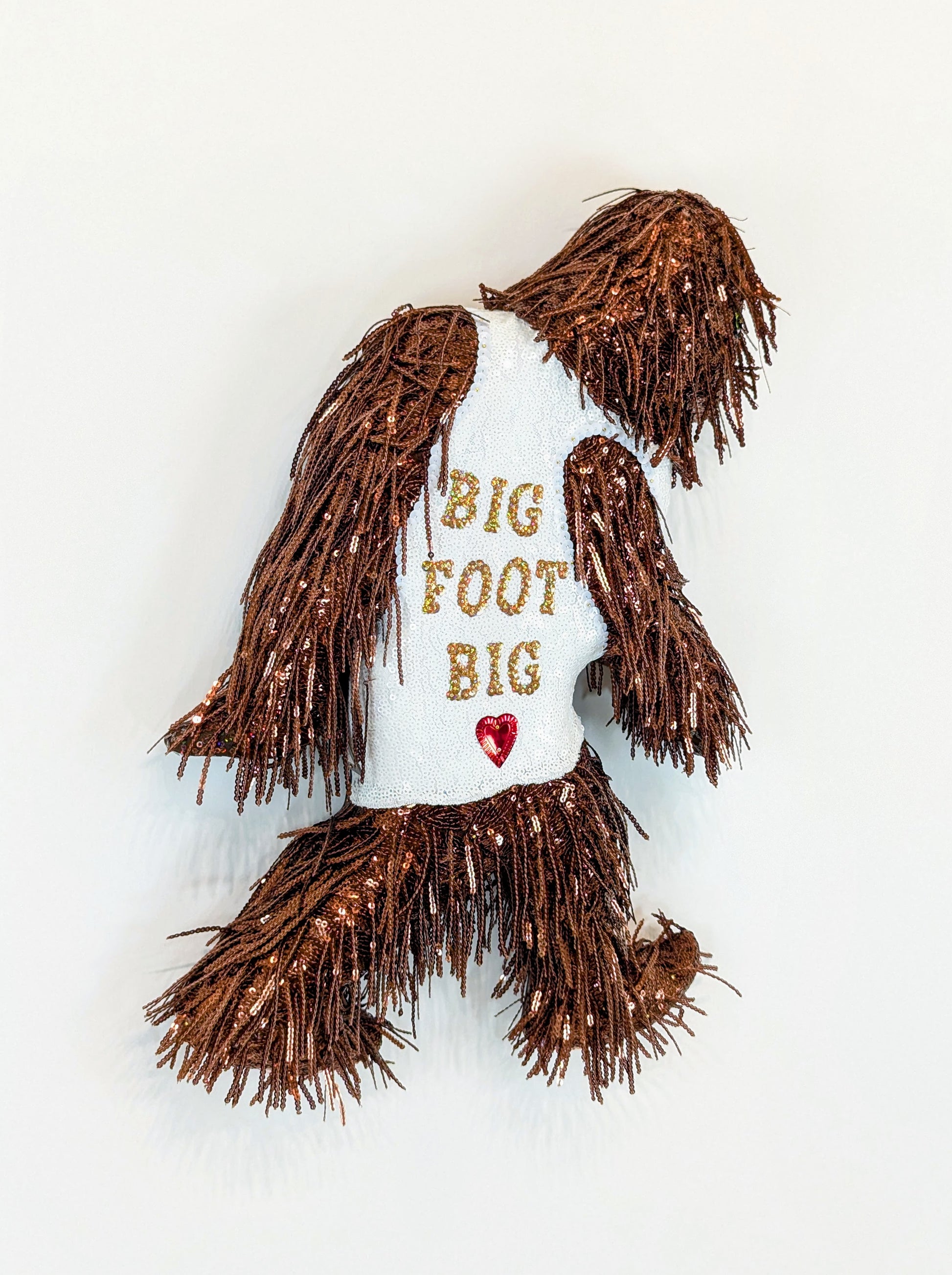 This Sasquatch may be small, but his heart is mighty! This 3D sequin sculpture uses brown fringe to mimic fur. His white tank top says "Big Foot Big (Heart)" in gold sequined letters. He's mounted onto a wooden board and is wired and ready to hang on the wall.