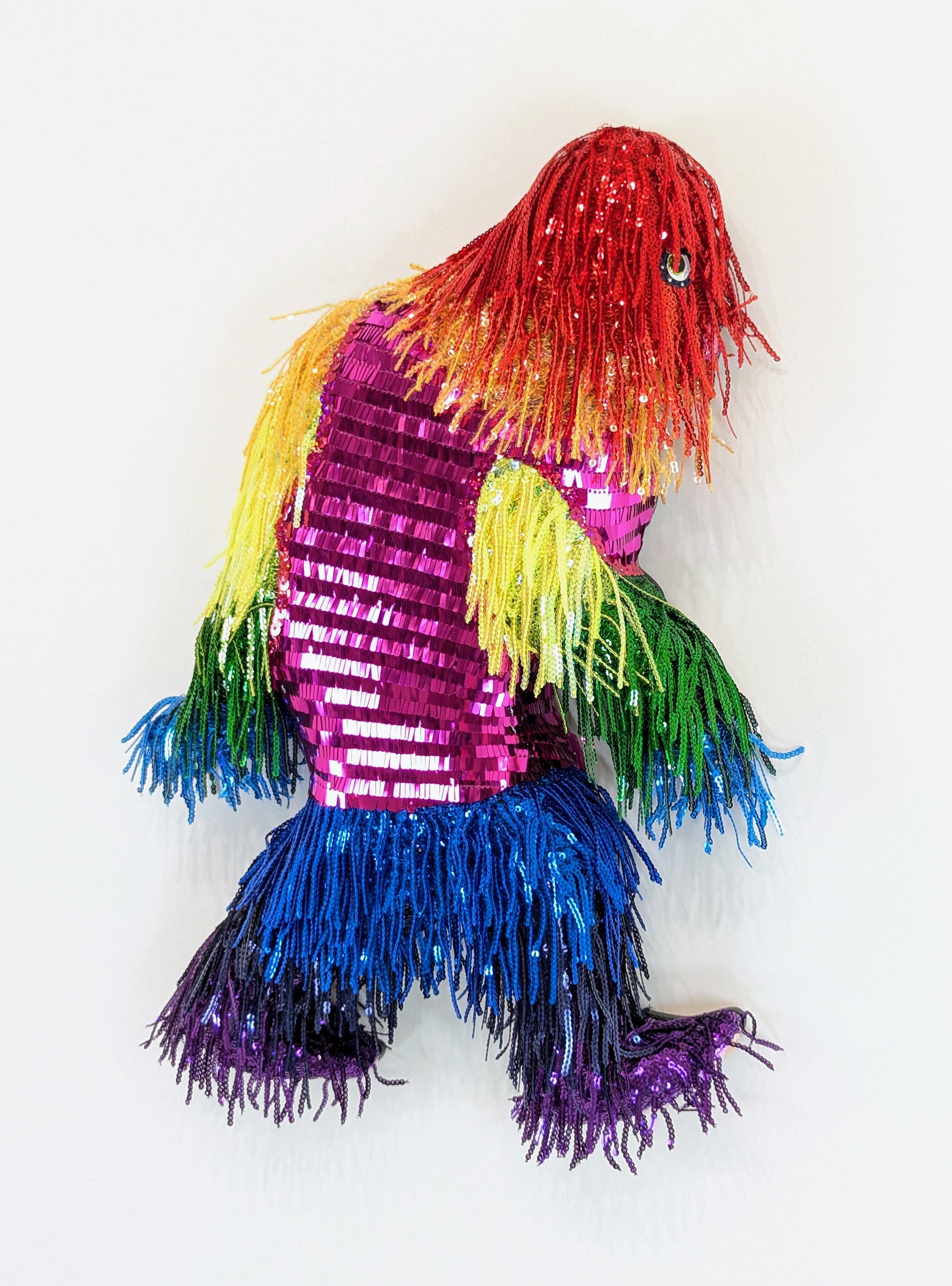 This Sasquatch is ready to hit the disco floor! This 3D sequin sculpture uses a rainbow of fringe colors to mimic its' fur. The tank top features hot pink piano key fringe. This piece is mounted onto a wooden board and is wired and ready to hang on the wall.