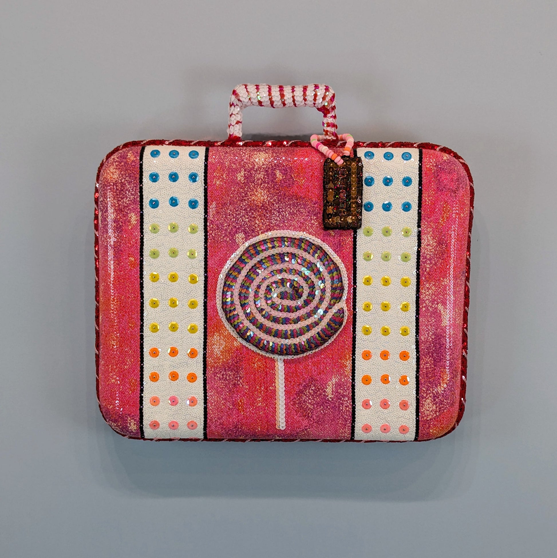 Inspired by vintage suitcase styles, "Candy Case" pays tribute to some old fashioned candies. Strips of candy buttons form the 'straps,' a giant raised lolly is the center decoration, and the luggage tag is made from a Hershey's chocolate bar and a candy necklace combined. The background fabric is a mottled mix of pinks, purple and oranges (and came off a cool jacket from a thrift store), and the handle is candy cane striped.