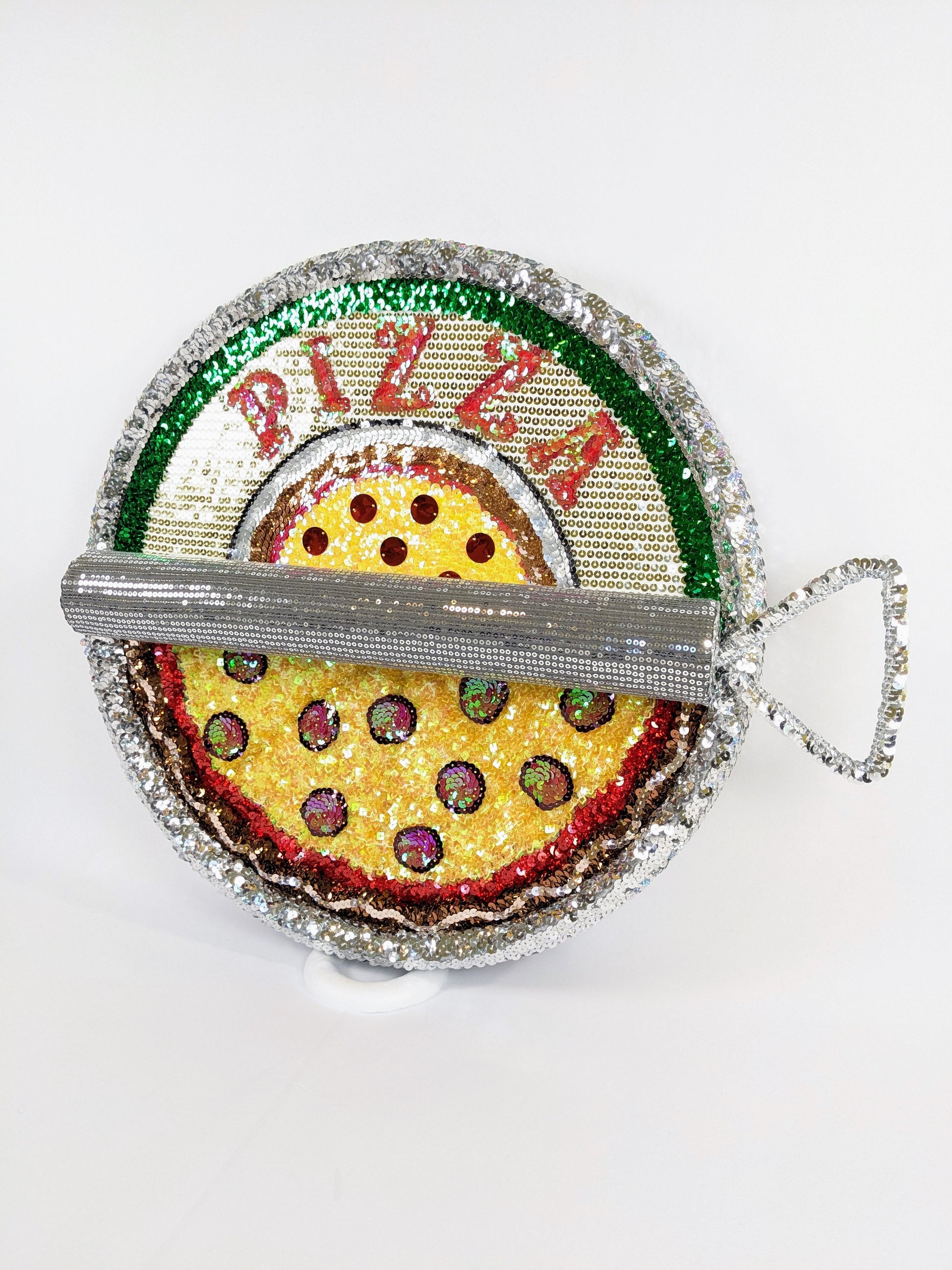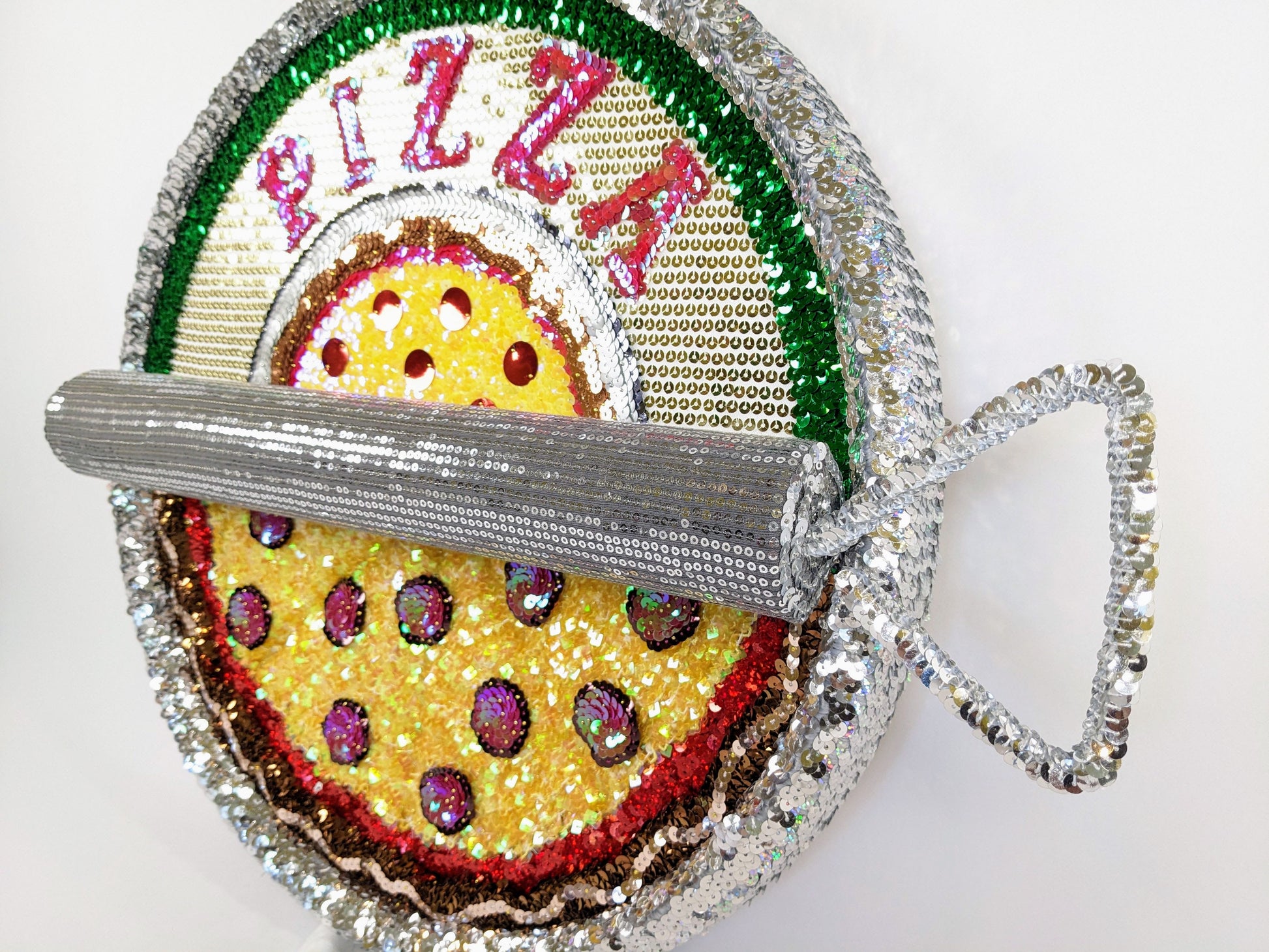 This is the second piece in my ‘canned’ series where I put food that can’t be canned in a can. My favorite part is the juxtaposition between the ‘real’ pizza in the can, and the pizza on the label. I used unique textures and sequin colors to emphasize the differences.