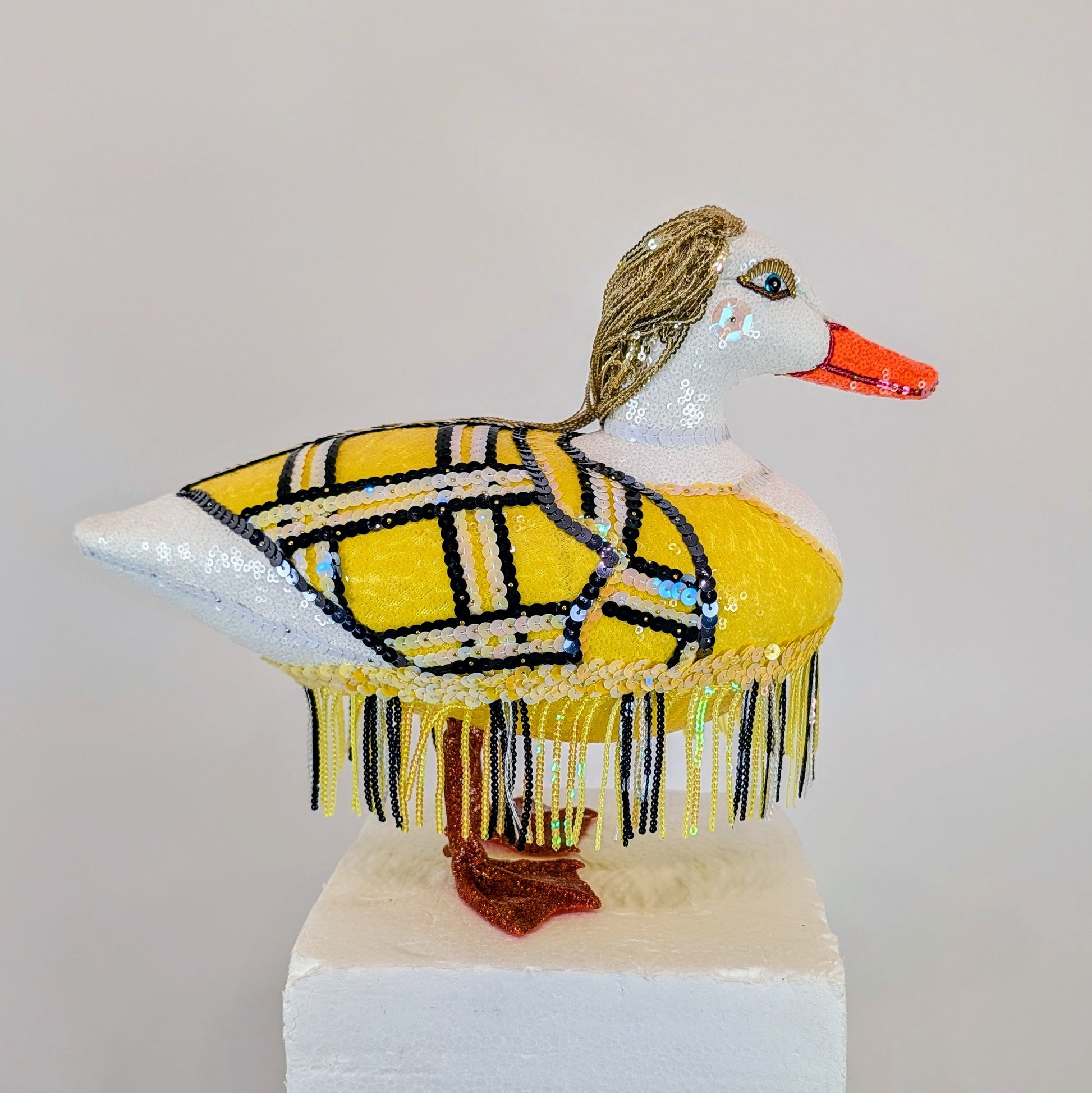 "Clueless Duck" pays homage to Cher Horowitz's character from the film "Clueless." Wearing her fabulous yellow plaid outfit, the skirt is made from sequin fringe. Her long gold hair can be styled over one shoulder, or parted on either side. Her orange beak has light pink sequined lipstick, and her orange duck feet have been glittered and resined to retain their sparkle. Clueless Duck is a unique work of art, but by no means, a 'full on Monet.' As if!