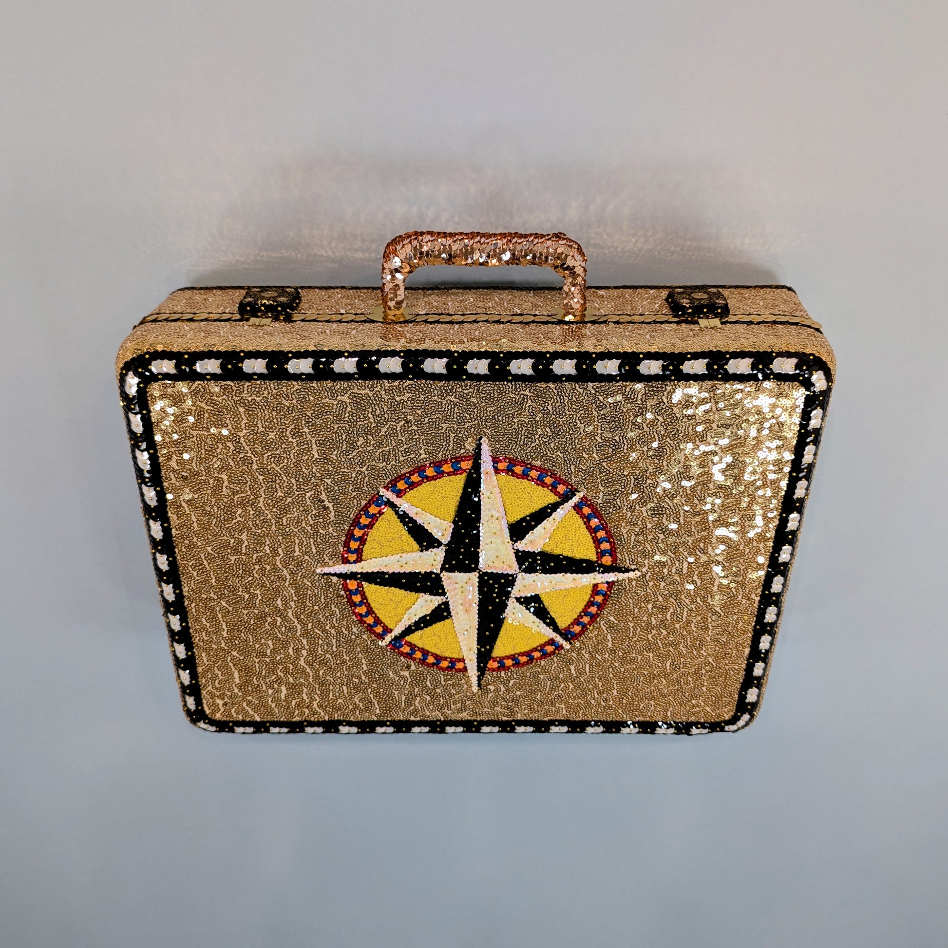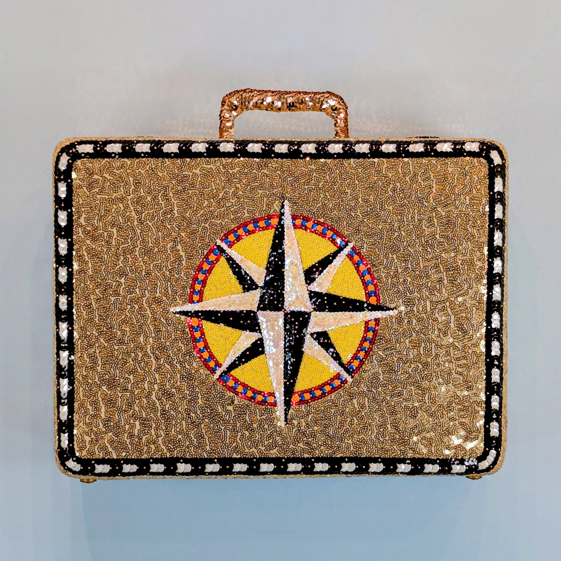 Inspired by vintage suitcase styles, "Compass Rose" features old map making elements. The rose in the center is made with black and white sequins, with a yellow background and blue and orange circle. The outer border in black and white also harks back to old printed maps. The background is done in a gold sequin fabric.