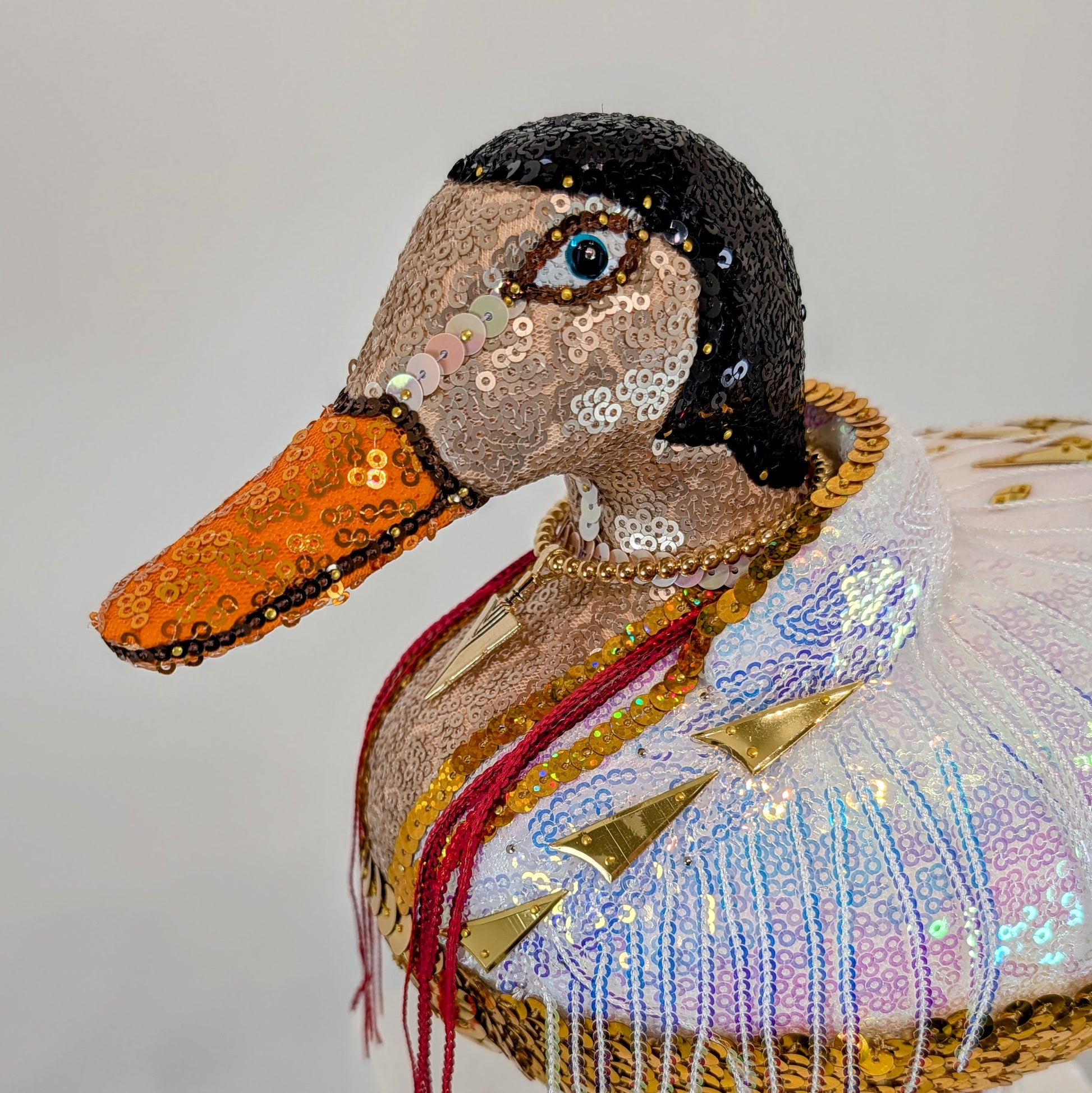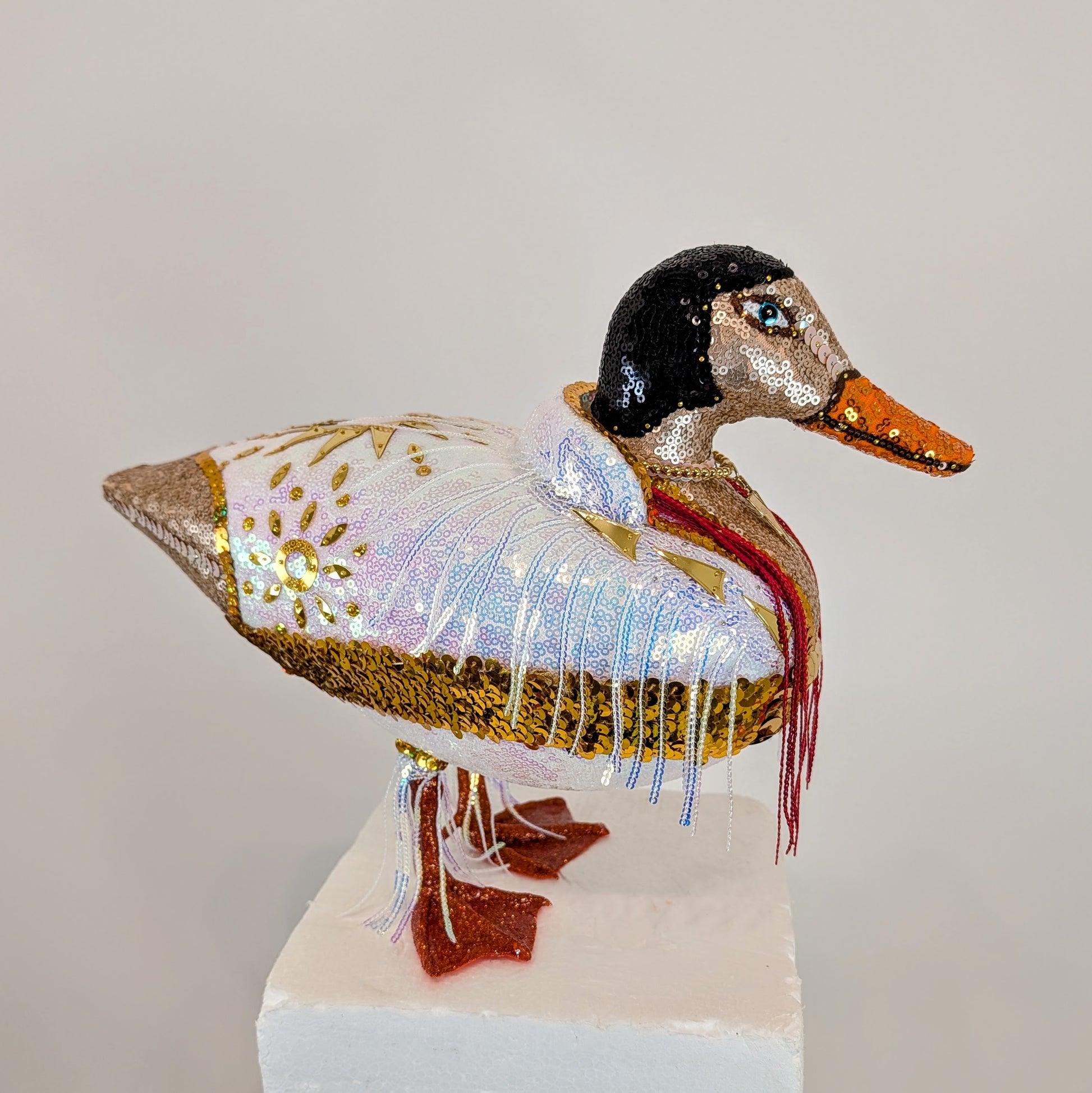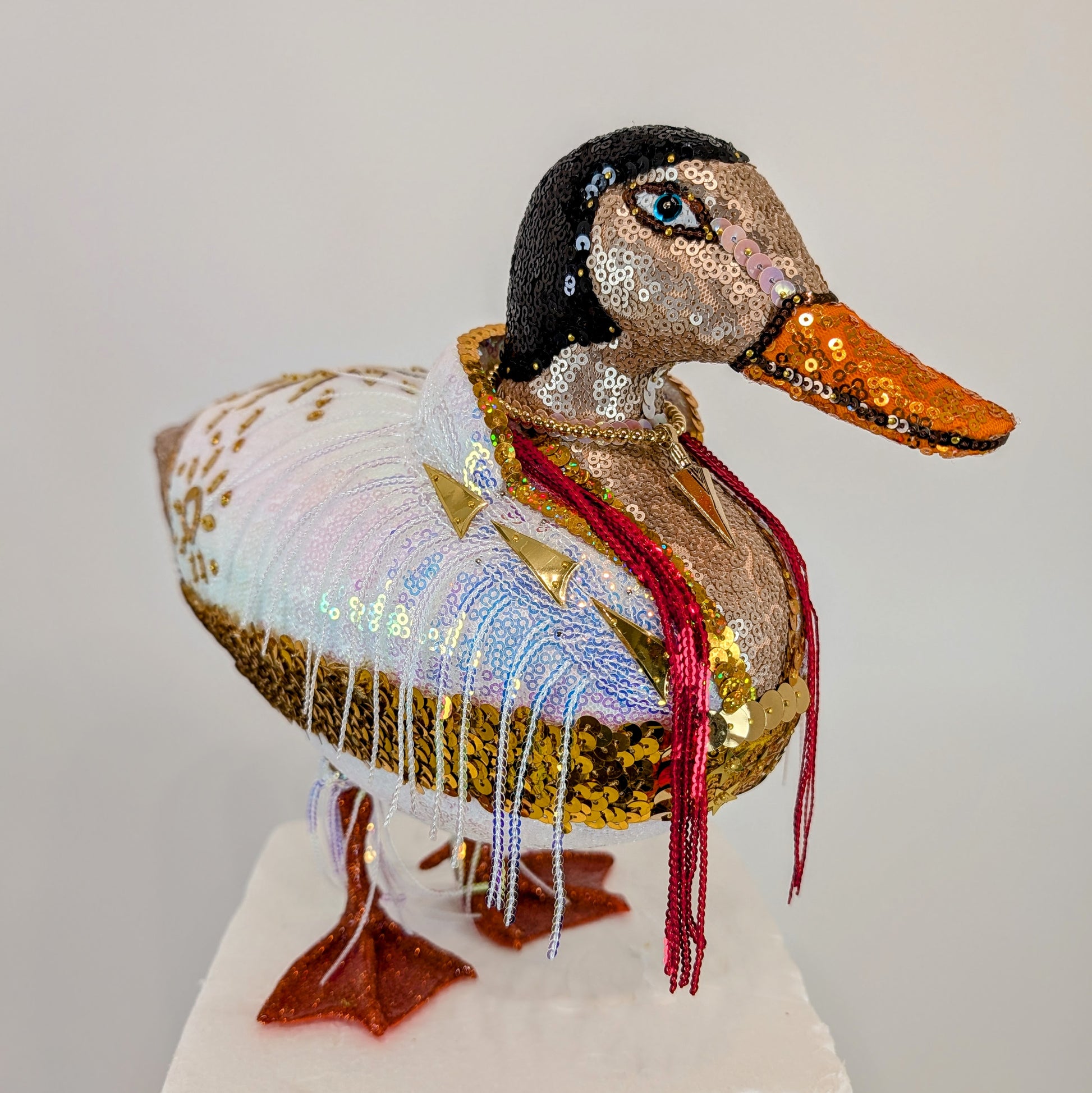 The King of ducks is here, Elvis Duck! Inspired by his Las Vegas jumpsuits, it features a thick gold belt, with starry buckle, and a high white collar. White fringe drapes his shoulders like a cape, and dangles around each leg. Gold sunburst sequins decorate his back and sides, and a red fringe scarf hangs around his neck. Elvis Duck has a gold necklace with an arrowhead pendant, and his midnight black hair has generous sideburns. His feet are covered in orange glitter and resined to retain their sparkle. He's ready to sing "Burning Love" and toss his scarf into the crowd.