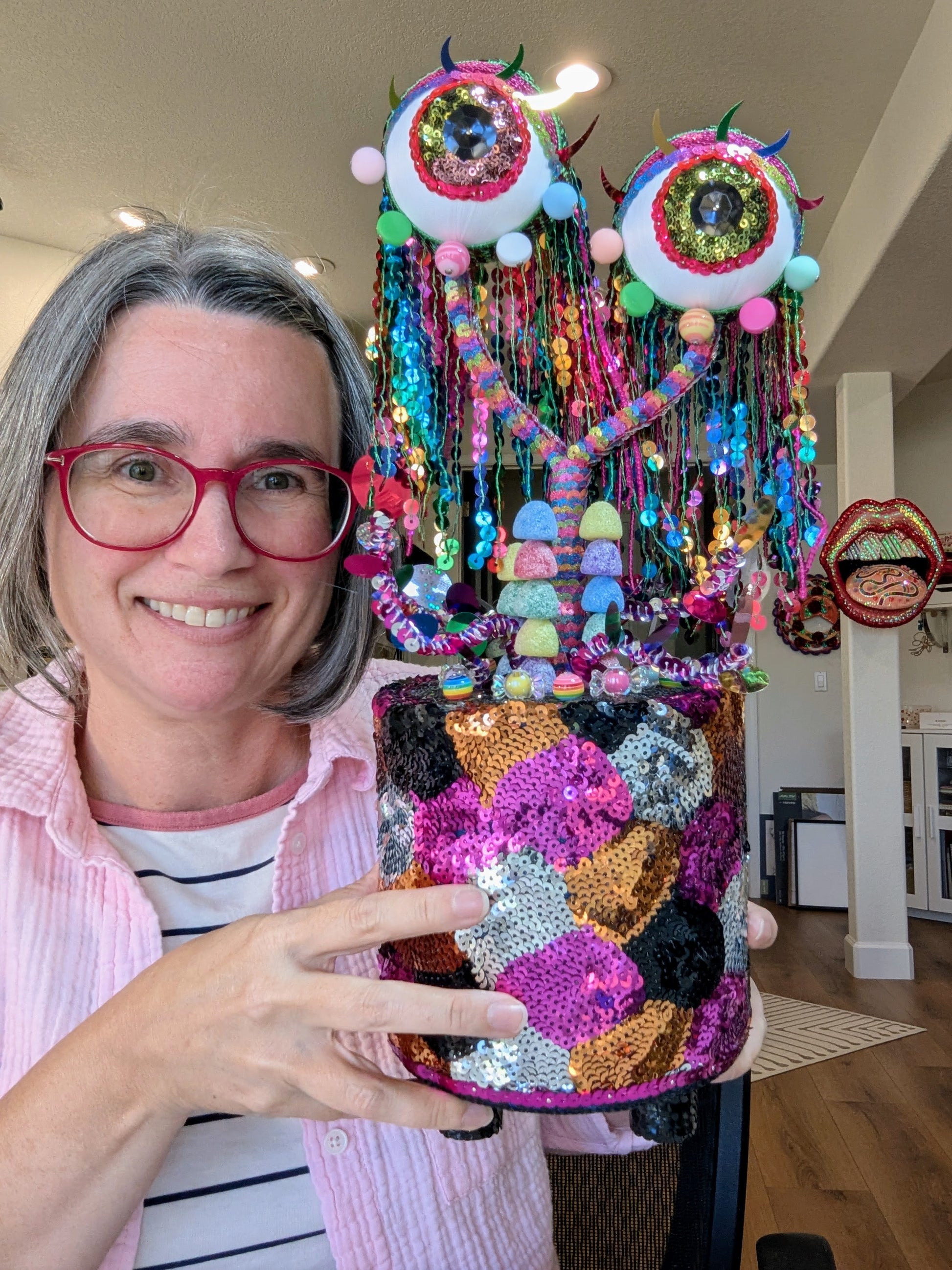 The Eye Candy Plant is a visual pun that's come to life! Plastic candy beads decorate two rainbow fringed eyes, supported on a rainbow swirled branch. At the base of the plant are gumdrop stacks, more candies, and the plant's strange leafy arms. The pot is covered in a patterned sequin fabric in black, silver, orange and hot pink, and it has four black sequined feet. For all confirmed plant killers out there, I can promise you that it will never die, and it will always watch you.