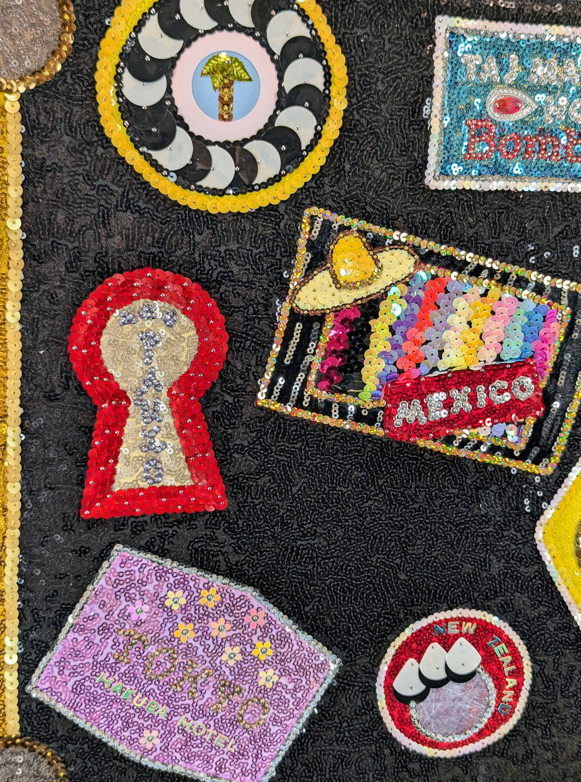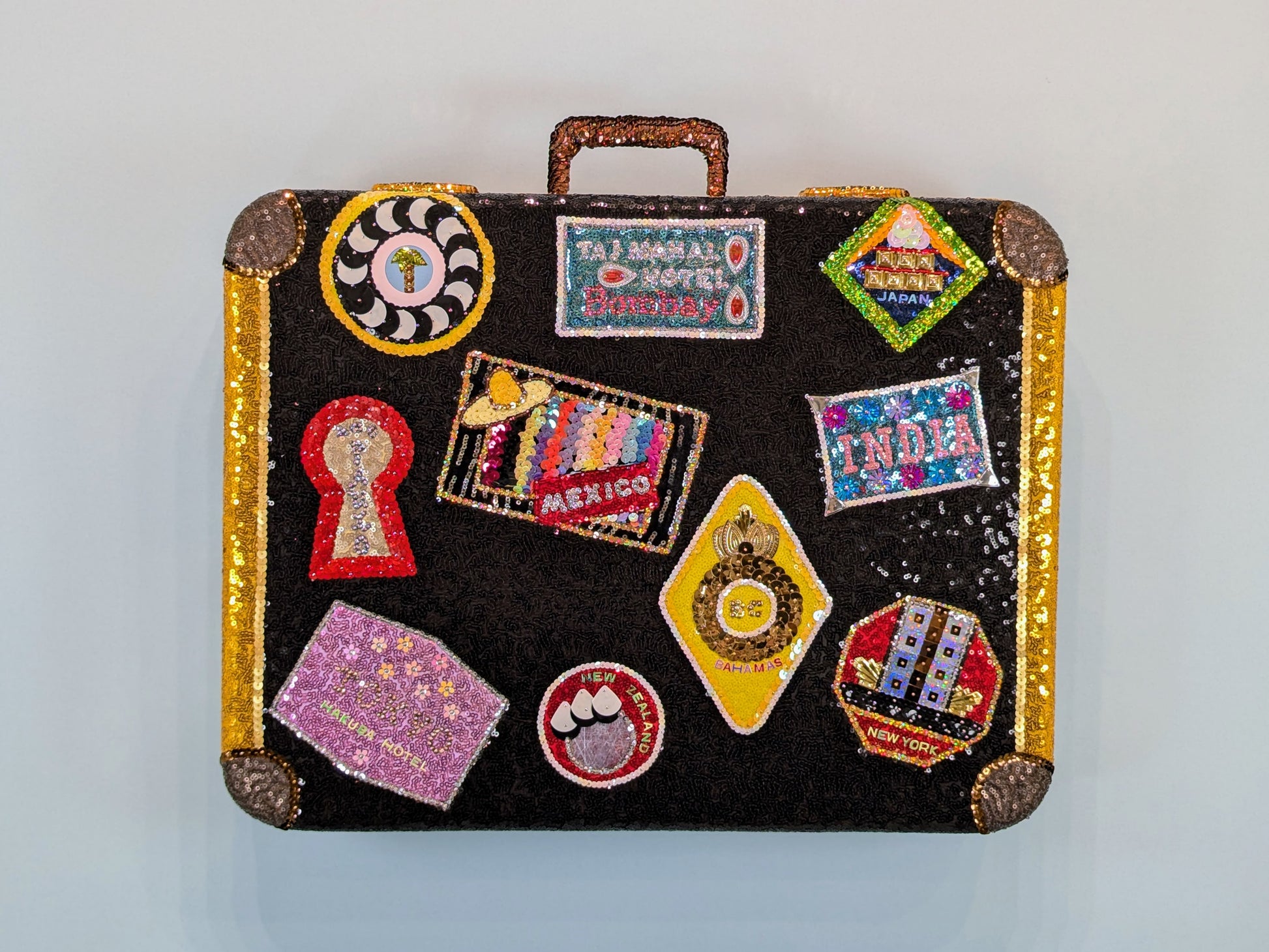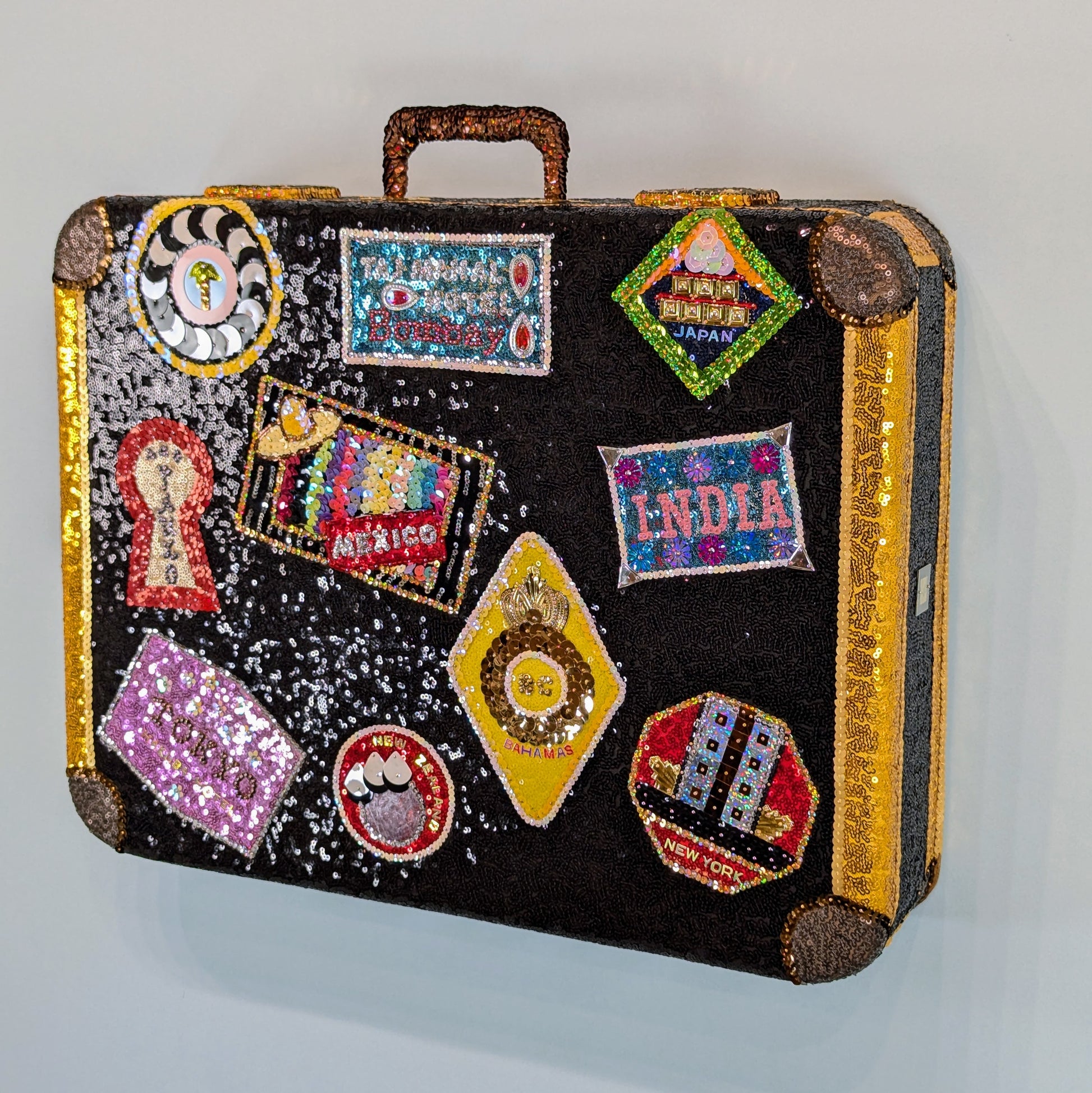 Inspired by the stickers that hotels used to paste onto their guests' bags, this suitcase mimics vintage pieces that used to be crafted in leather. This version is covered in sequins instead. The background fabrics include both black and rich golds. All of the stickers were based on real historical examples, and created individually with sequins. This piece is named "Globetrotter" because the stickers come from cities and countries all over the globe.