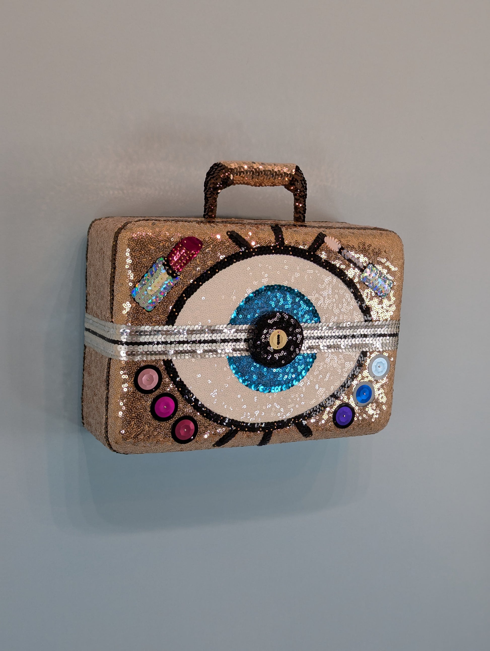 This makeup case series was based on vintage 'train cases' ladies used to take on railway trips. These cute, chubby boxes with handles on top would hold makeup and have a built-in mirror. The Makeup Case features a large eye, with the 'lock' in the pupil. A mascara wand, lipstick, eye shadow and blush palette completes the look. This piece is crafted with champagne gold sequins and brown accents. As always, it is covered entirely in sequins.