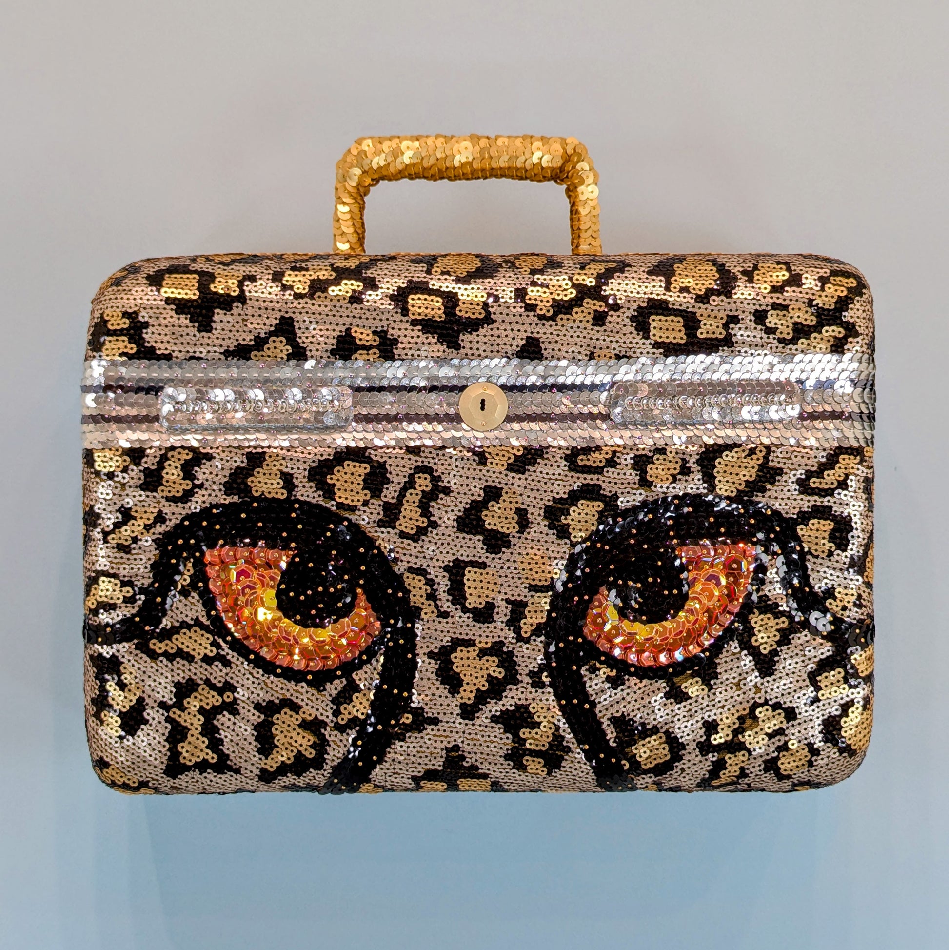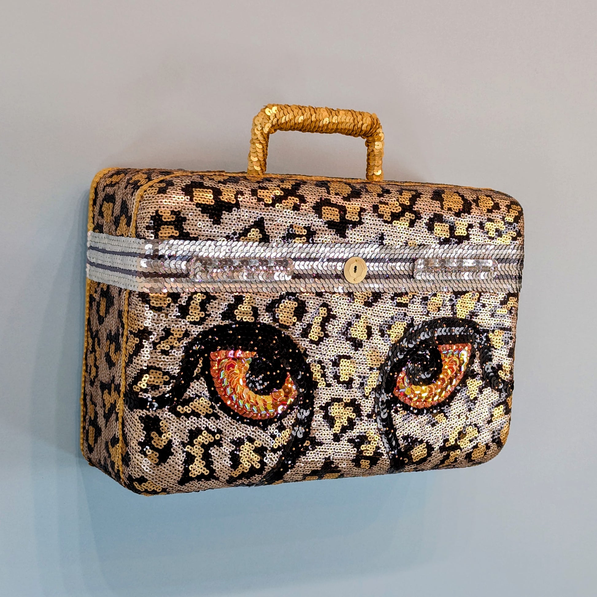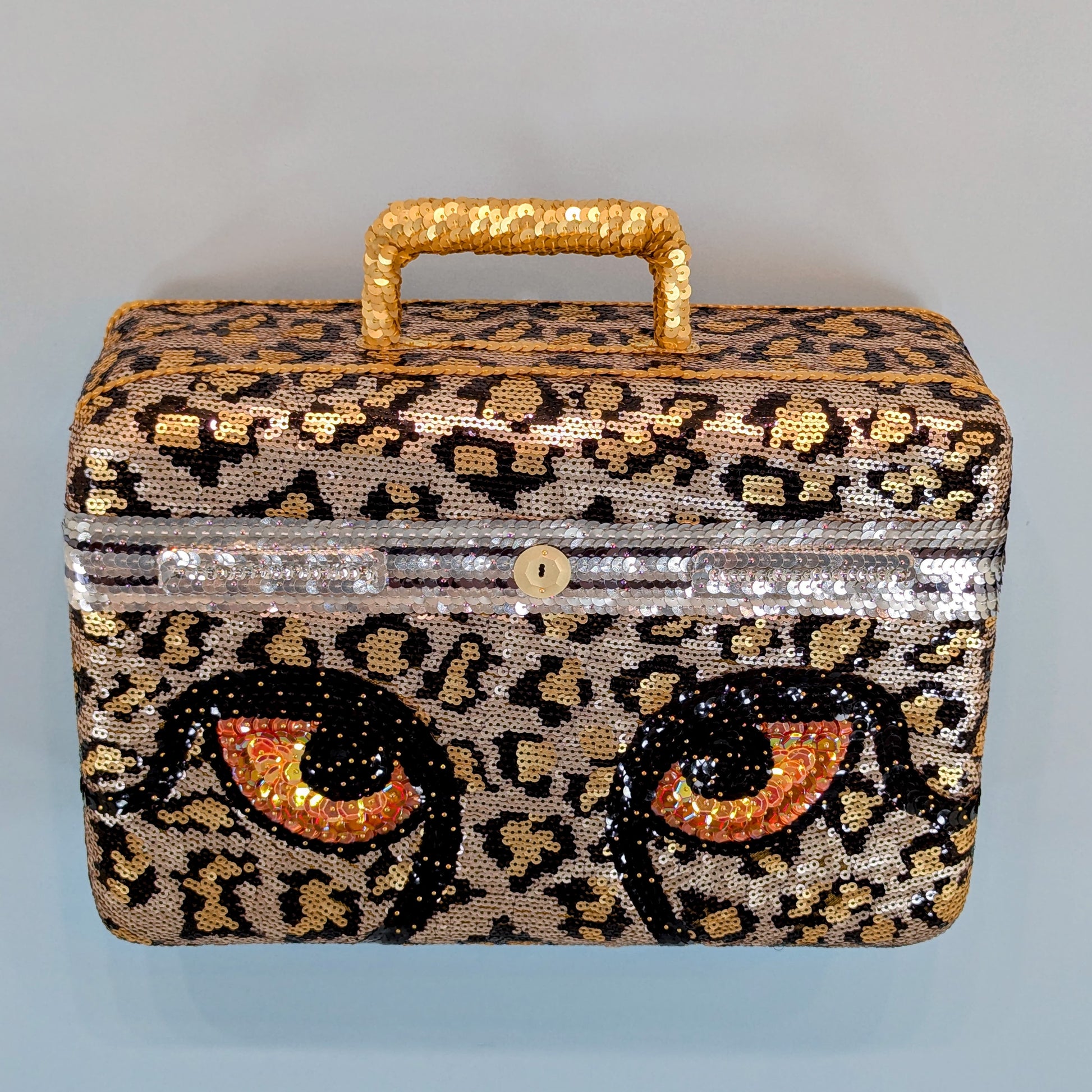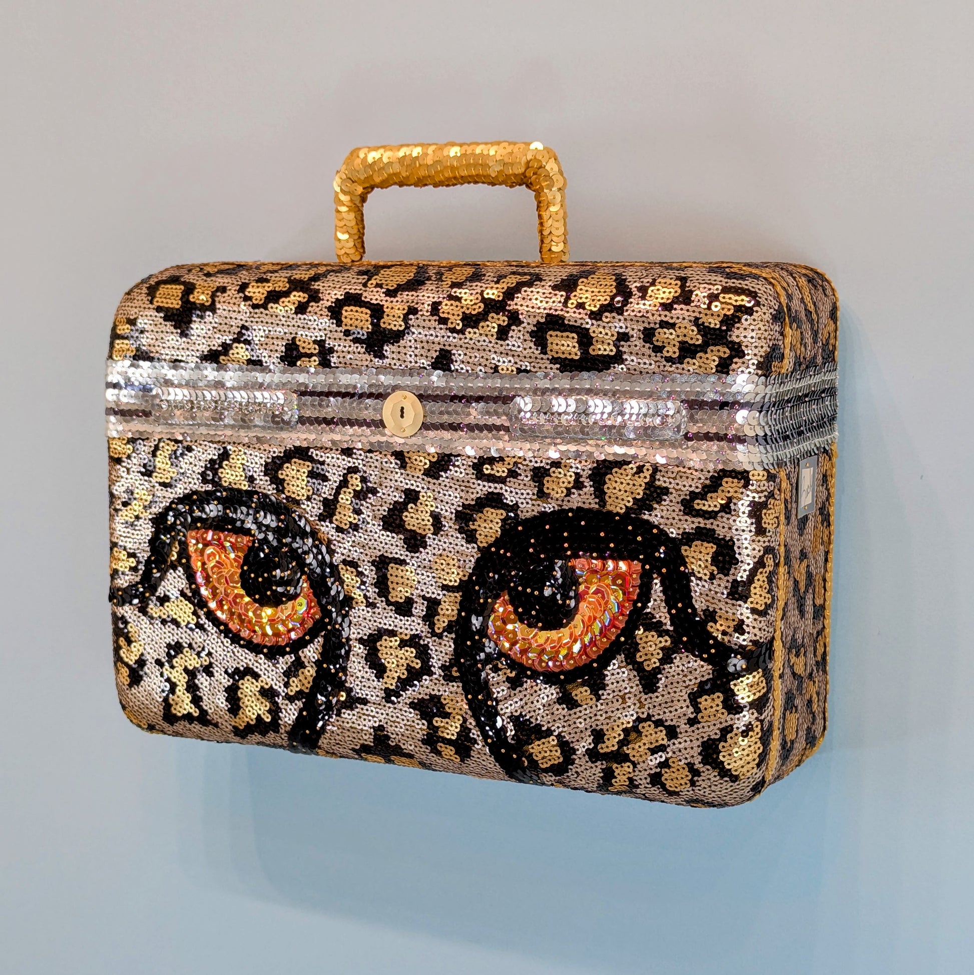 "Hello Kitty" was based on vintage 'train cases' ladies used to take on railway trips. These cute, chubby boxes with handles on top would hold makeup and have a built-in mirror. "Hello Kitty" features a pair of cat eyes and an overall cheetah print fabric in sequins. The fabric for this case came from a men's jacket I bought in a Salvation Army Thrift Store. It was a thrill to find, because I've never seen this sequin fabric before.