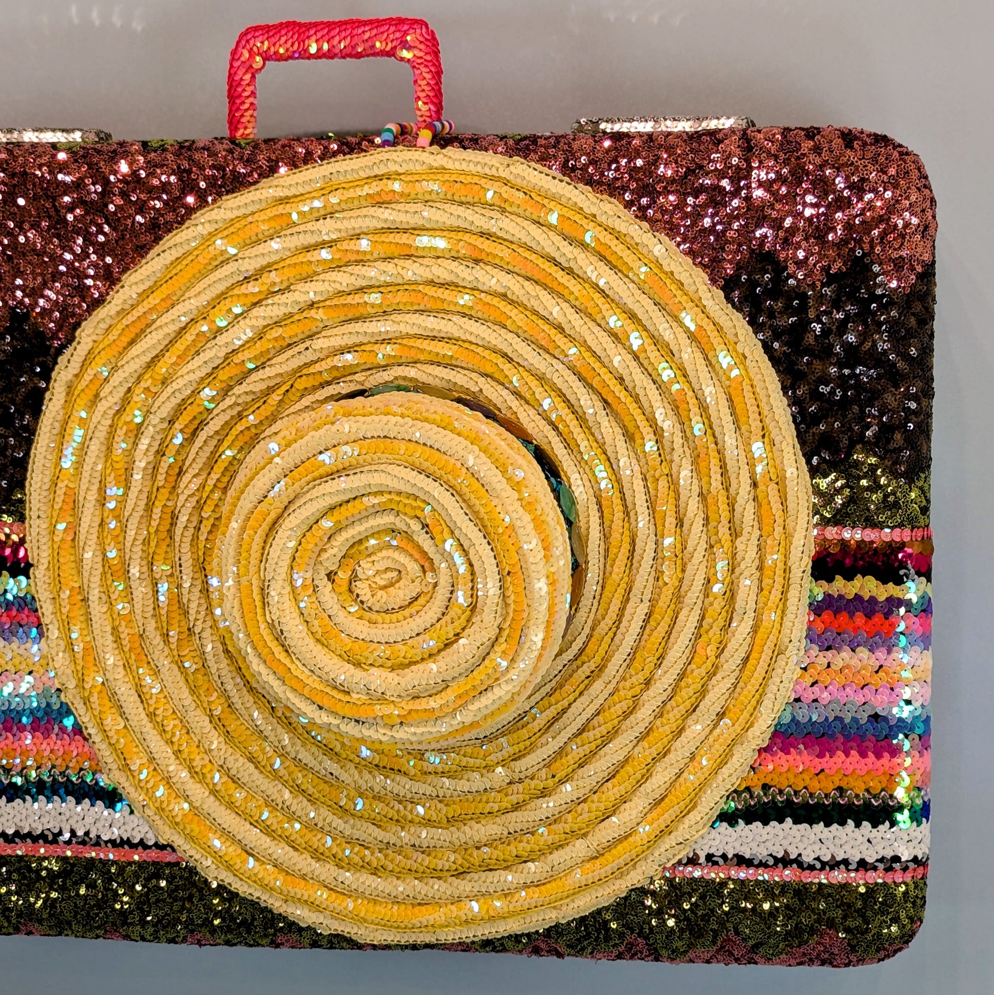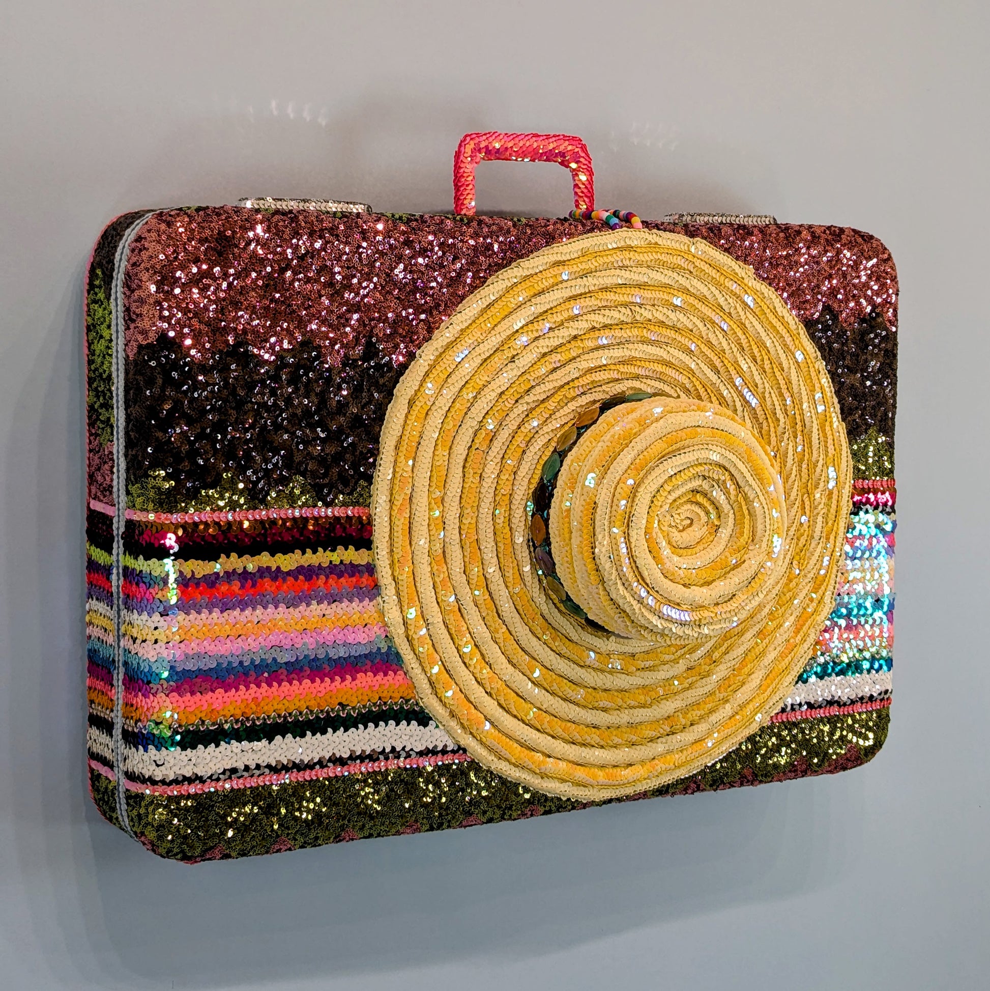 "Margaritaville" is a 3D sequin sculpture that looks like a colorful, vintage suitcase with a straw hat tied on top. Any tropical destination will do. The hat was constructed with a coiled sequin technique that gives the hat depth. The hat band has diamond shaped beads that came from a vintage necklace.