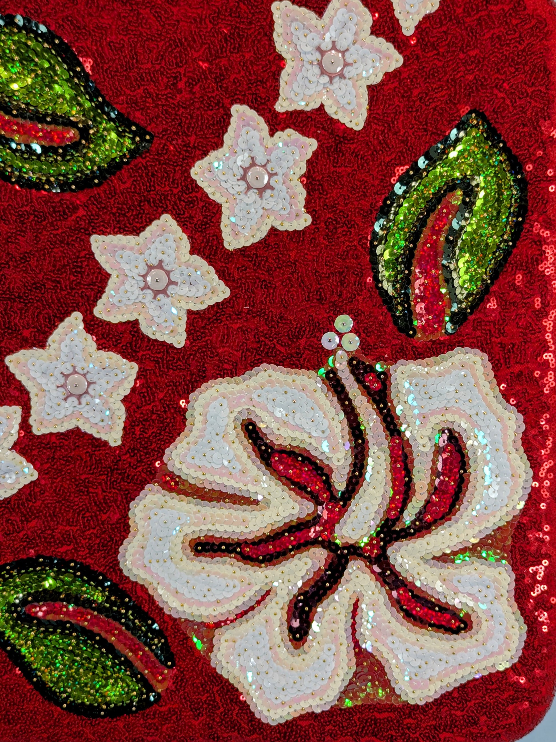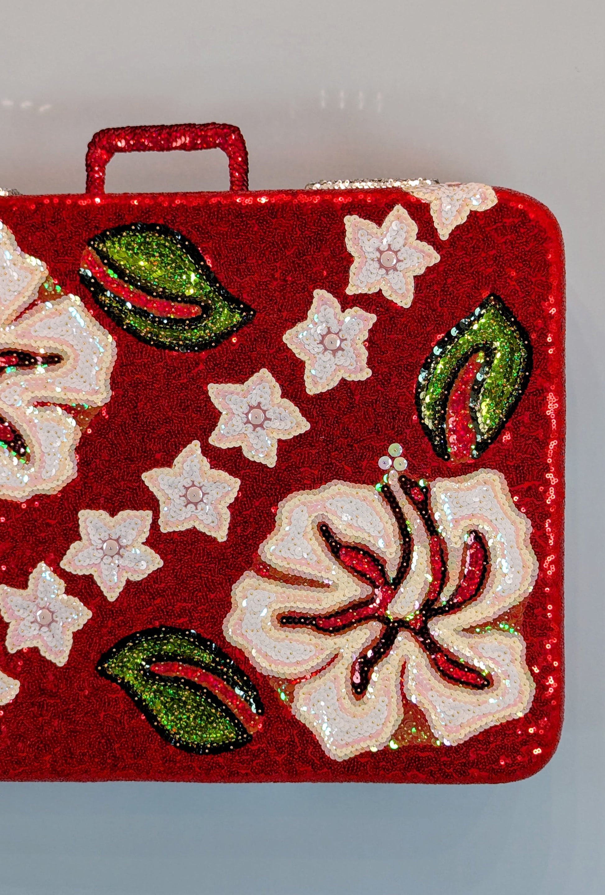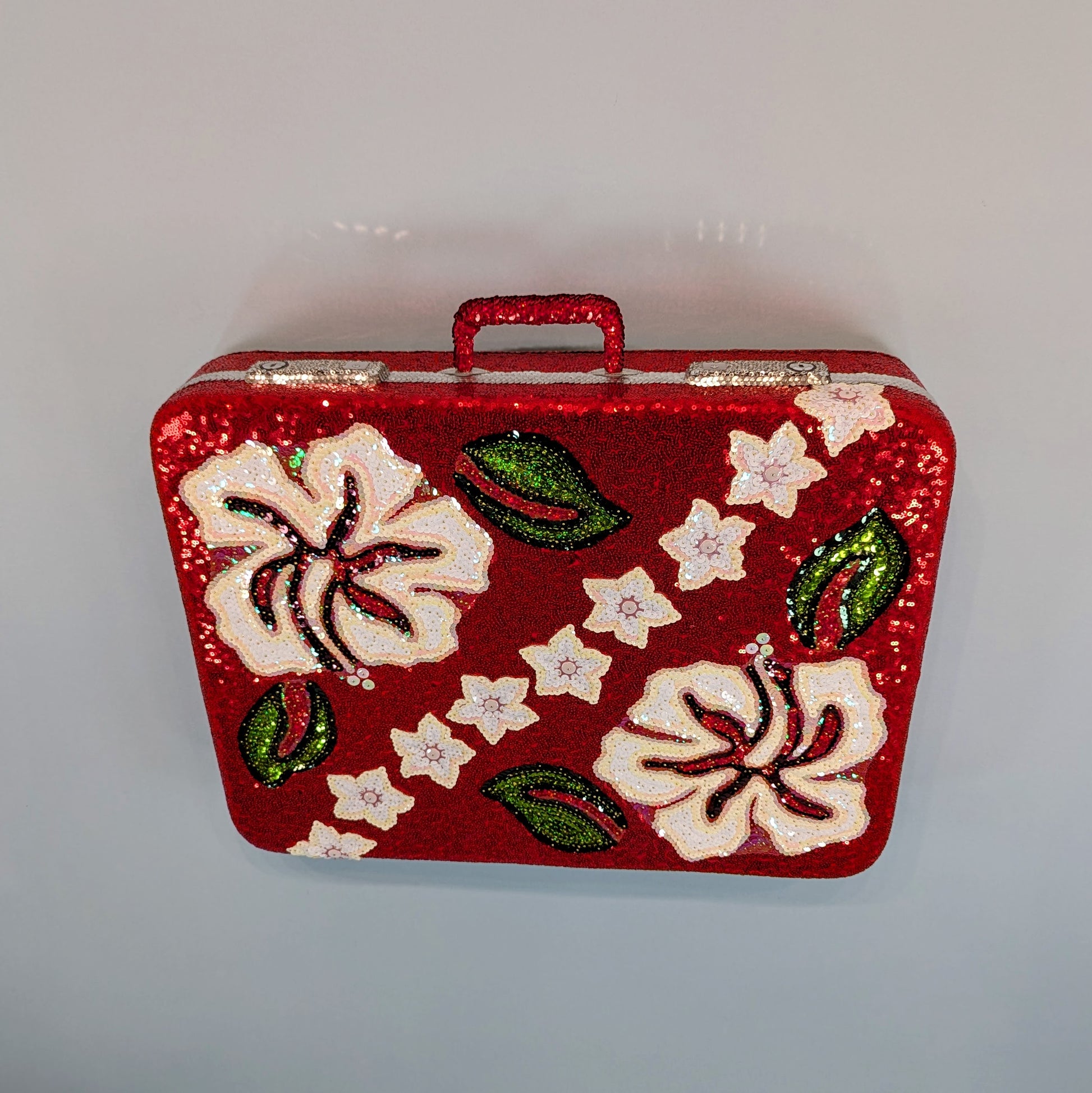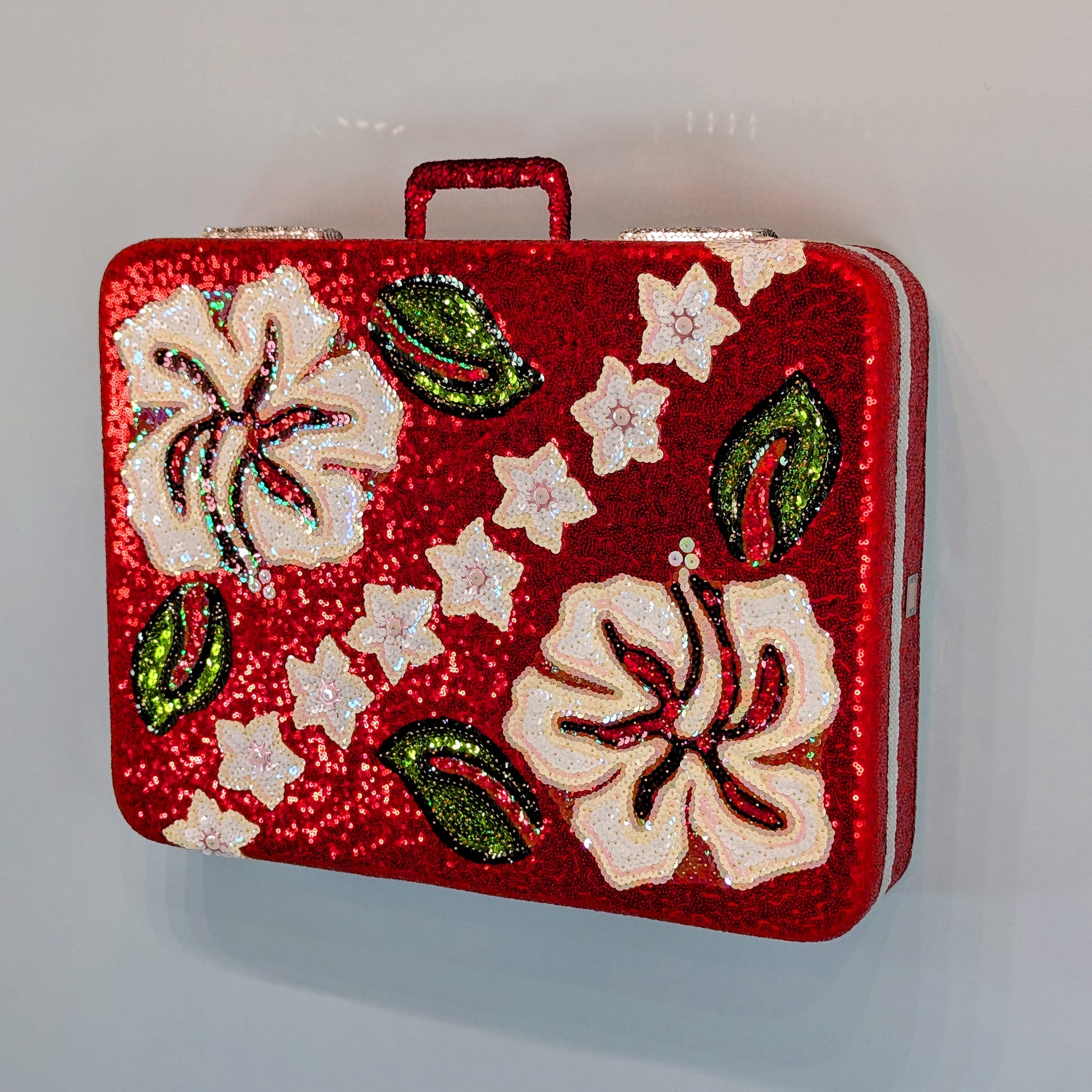 The day I was inspired to make this piece, I was in the produce aisle at the grocery store, and I noticed that the produce guy had a cheery Hawaiian shirt with a red background and white flowers and green leaves. It only stands to reason that a Christmas-colored, Hawaiian-themed suitcase could only have one name: "Mele Kalikimaka," which is the Merry Christmas greeting in Hawaiian, and made famous by the Bing Crosby song.