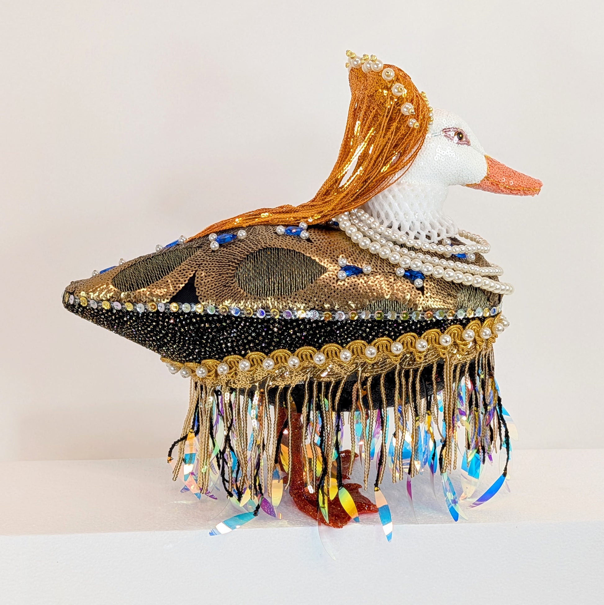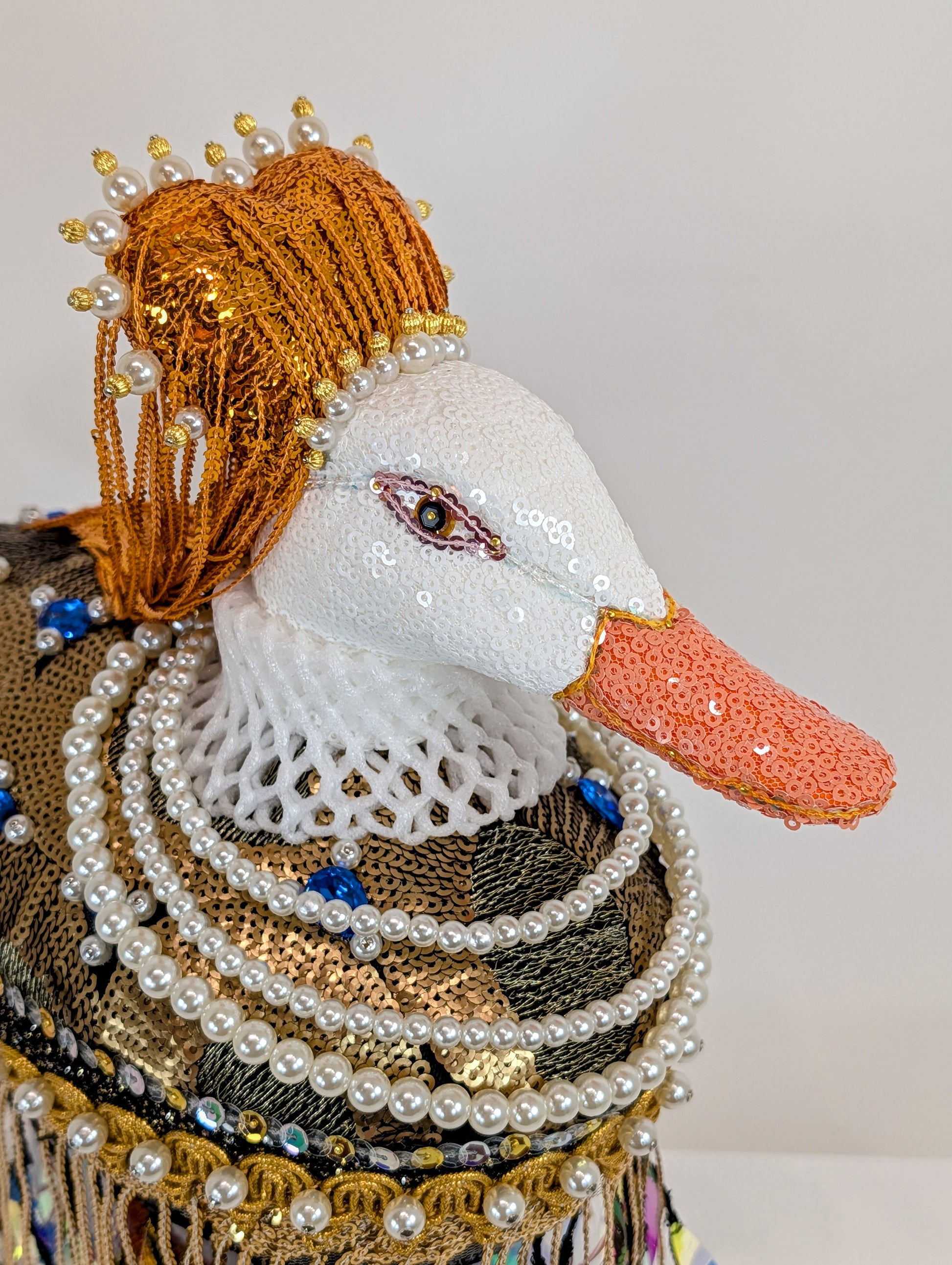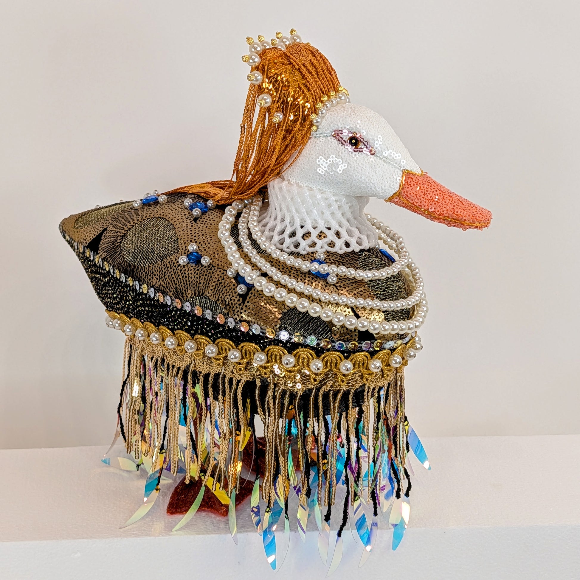 She's the queen of ducks, Queen Elizabeth I of England! It's the second time I've done a piece dedicated to this historical English monarch, and I think it's because she's just so darn fascinating, not to mention her amazing visuals! Her black and gold sequin gown is dripping with fringe, pearls, and faux blue jewels. Her red hair is styled in her trademark heart-shape wig, and is studded with pearls and gold beads. Around her neck is a filigree net collar of styrofoam, and a triple strand pearl necklace. She stands on her own feet, which have been glittered and resined to retain their sparkly shine.