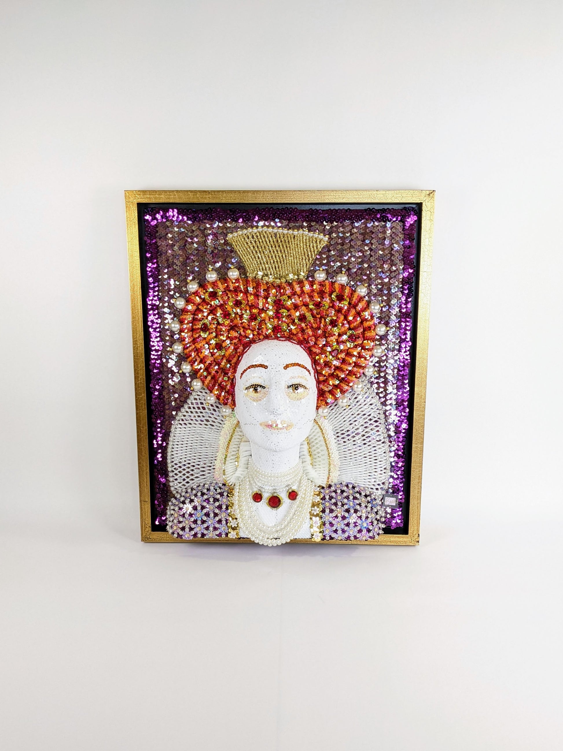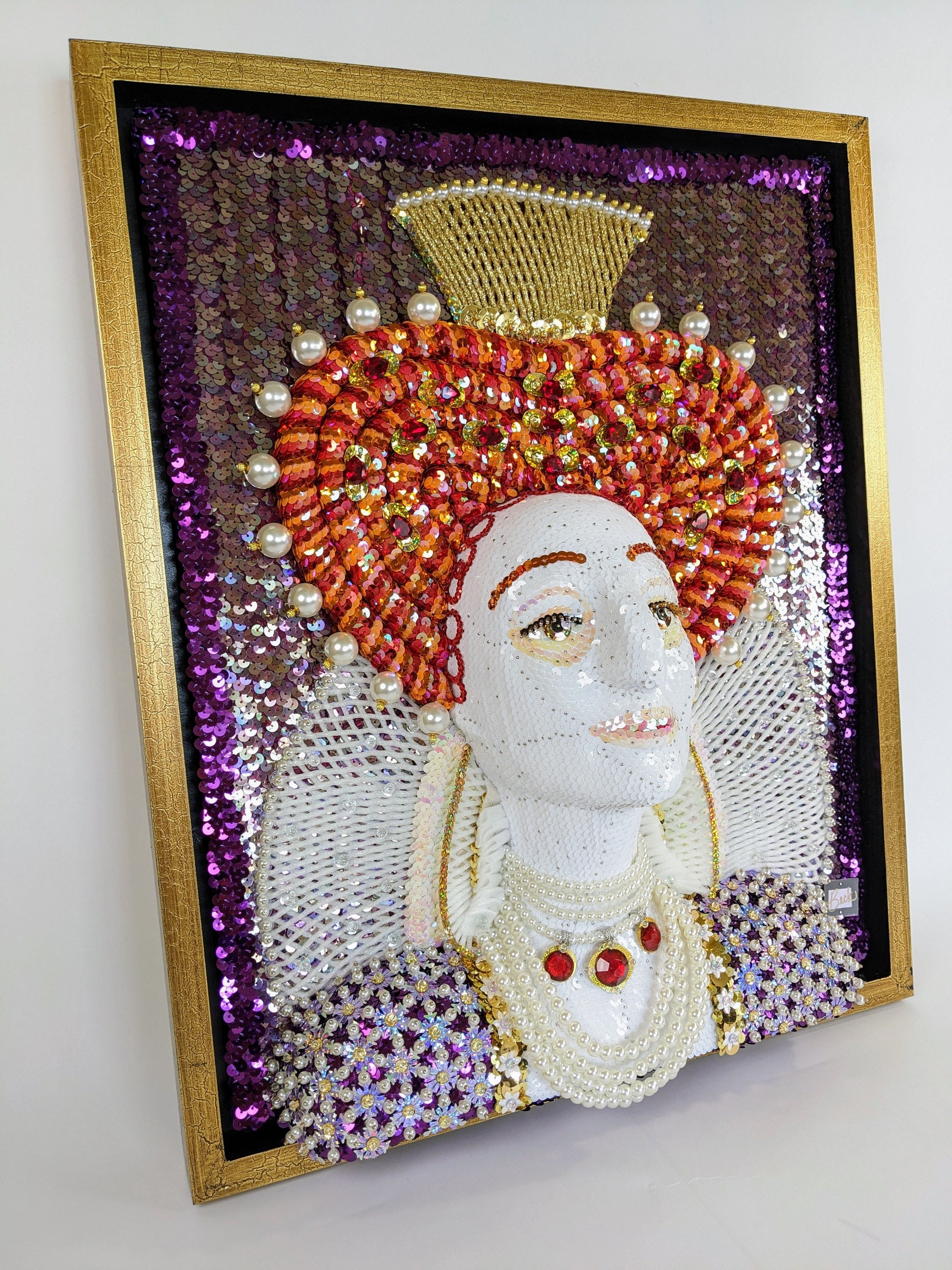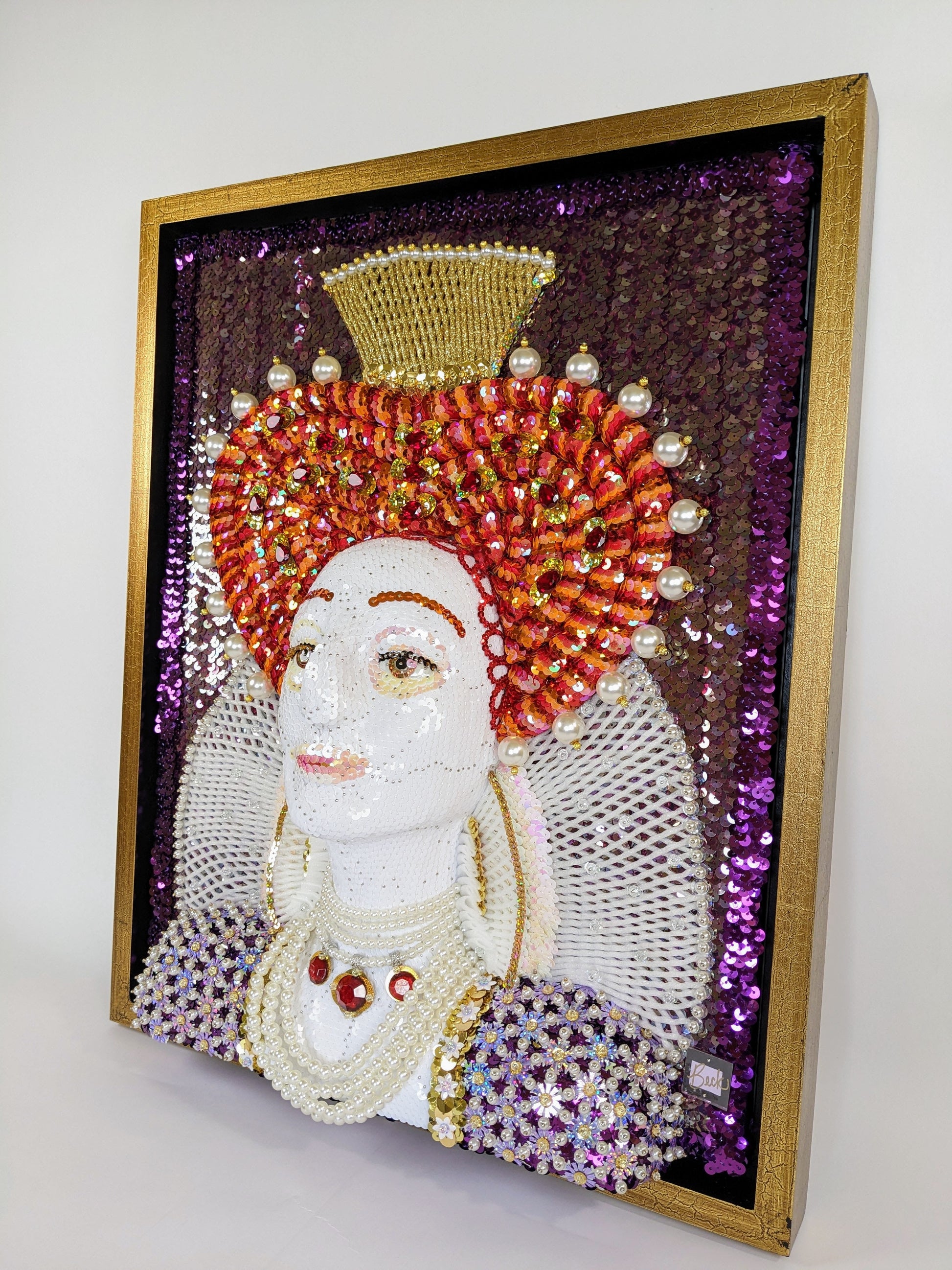 This artwork incorporates a lot of faux gemstones, pearls and crystal beads. (Fun fact: Elizabeth was always dripping with pearls in her portraits because it signified her purity, i.e., her status as The Virgin Queen who never married.)