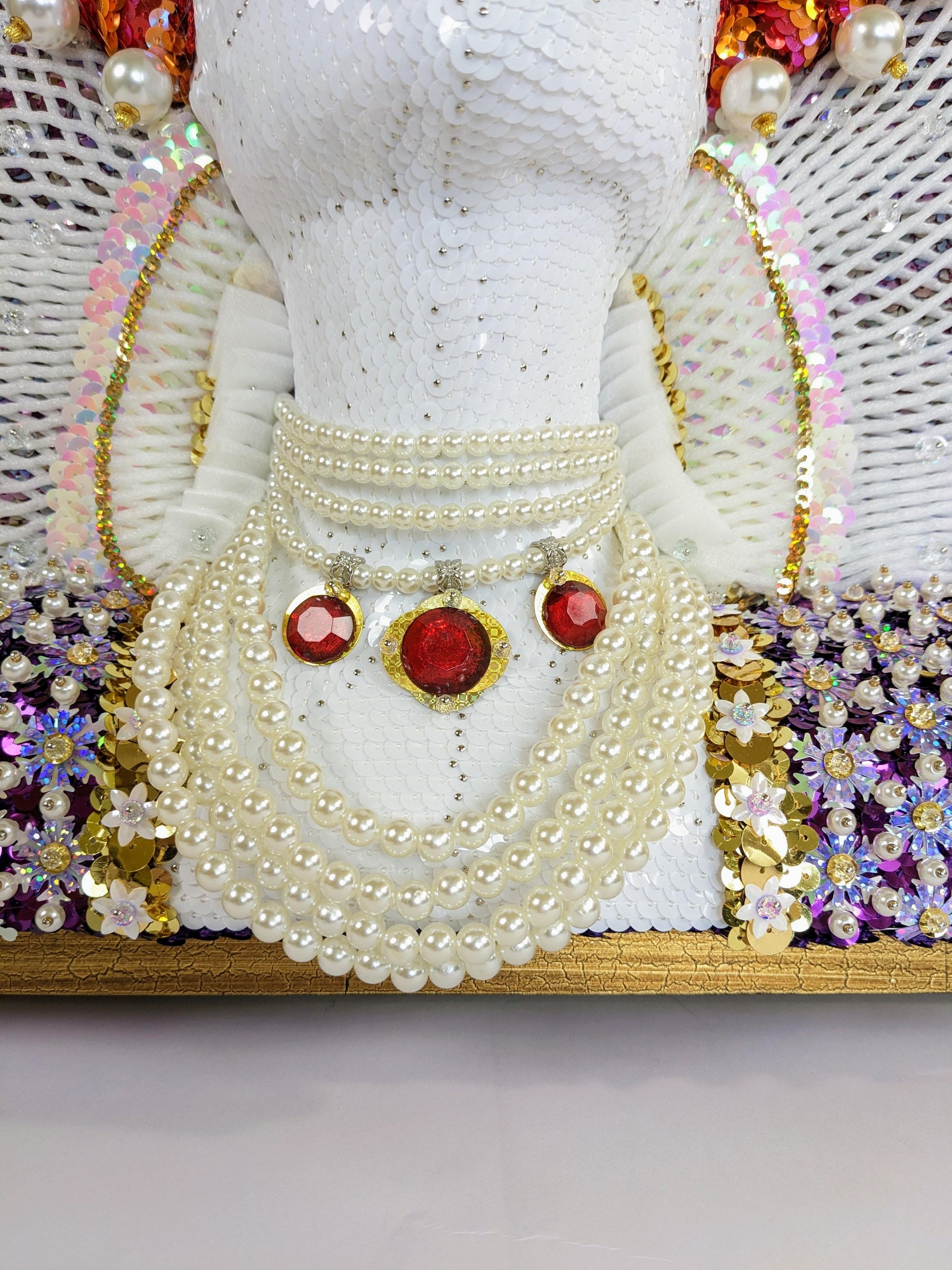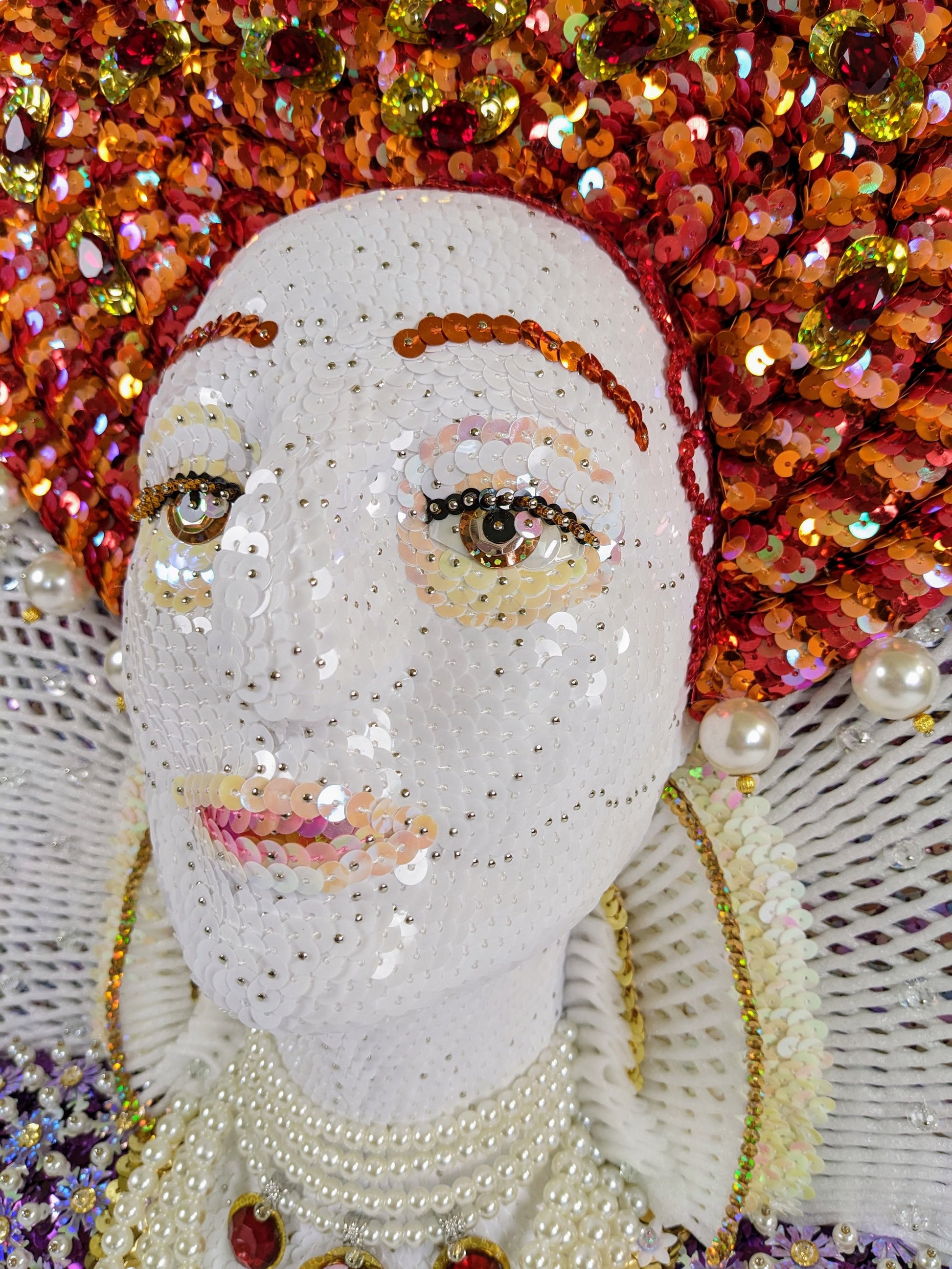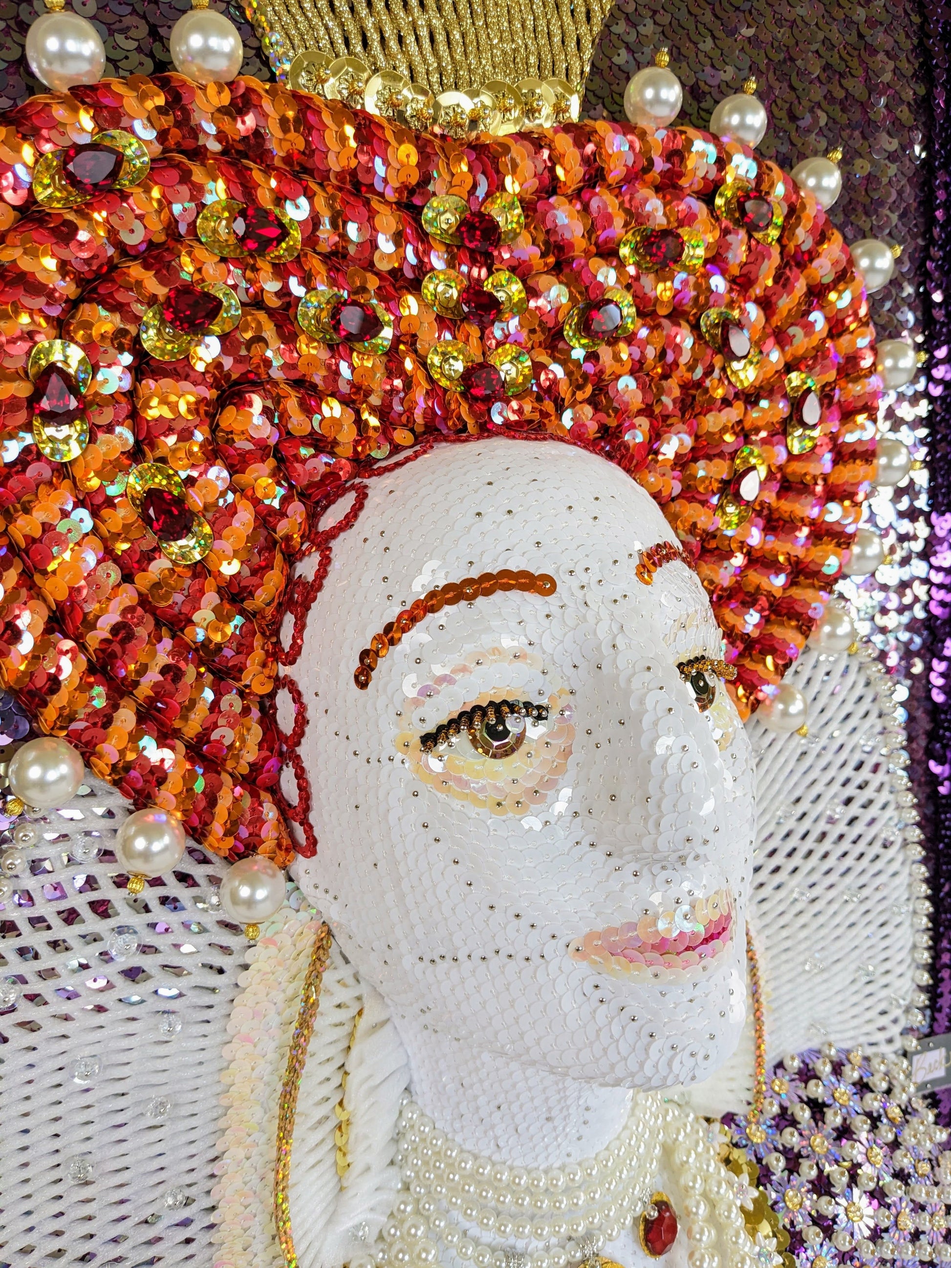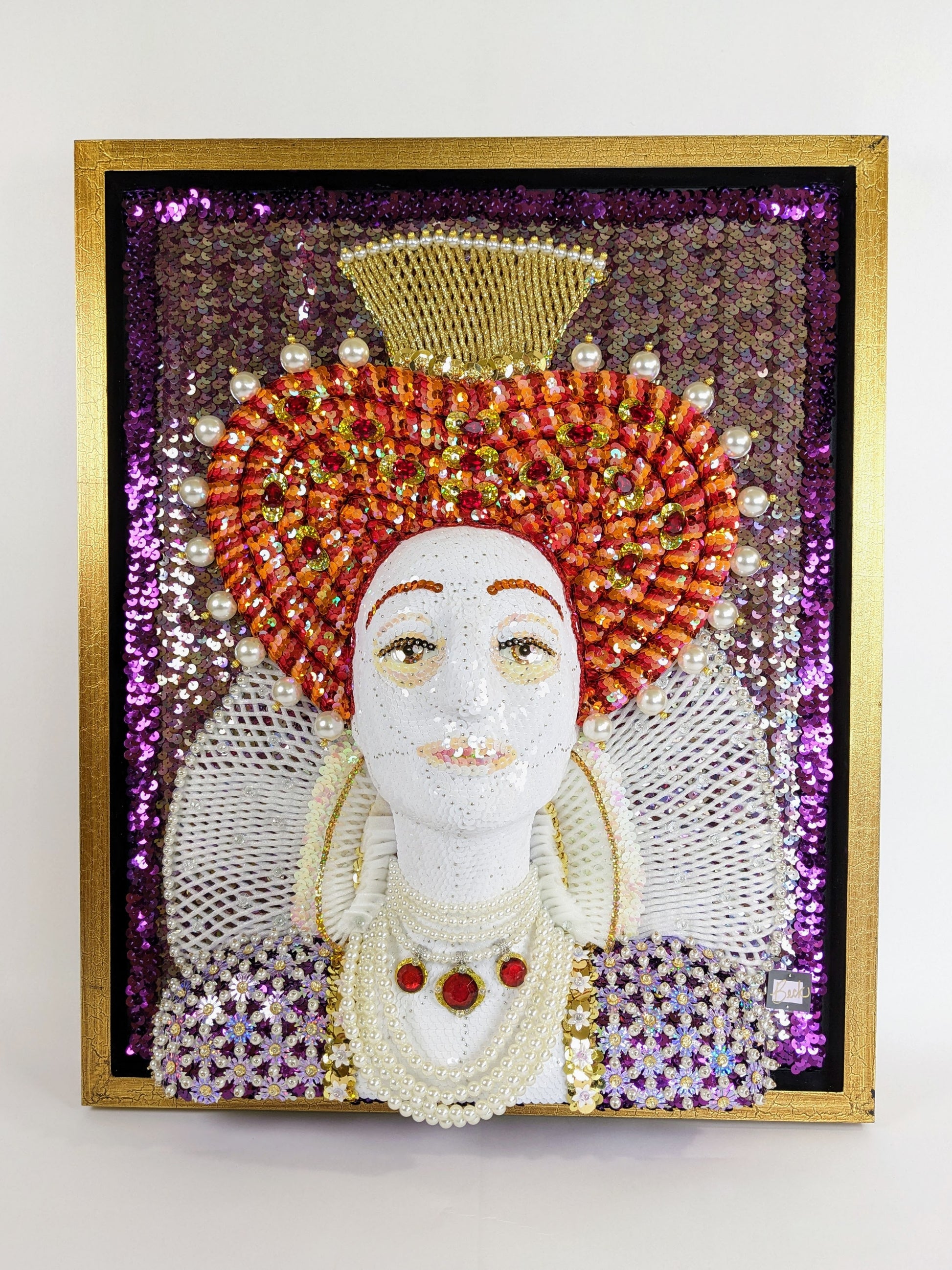 This artwork incorporates a lot of faux gemstones, pearls and crystal beads. (Fun fact: Elizabeth was always dripping with pearls in her portraits because it signified her purity, i.e., her status as The Virgin Queen who never married.)
