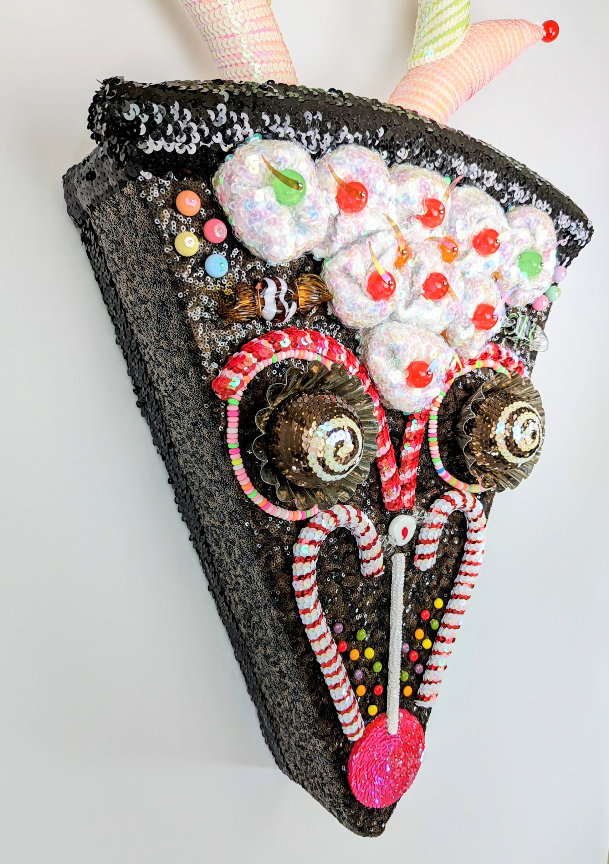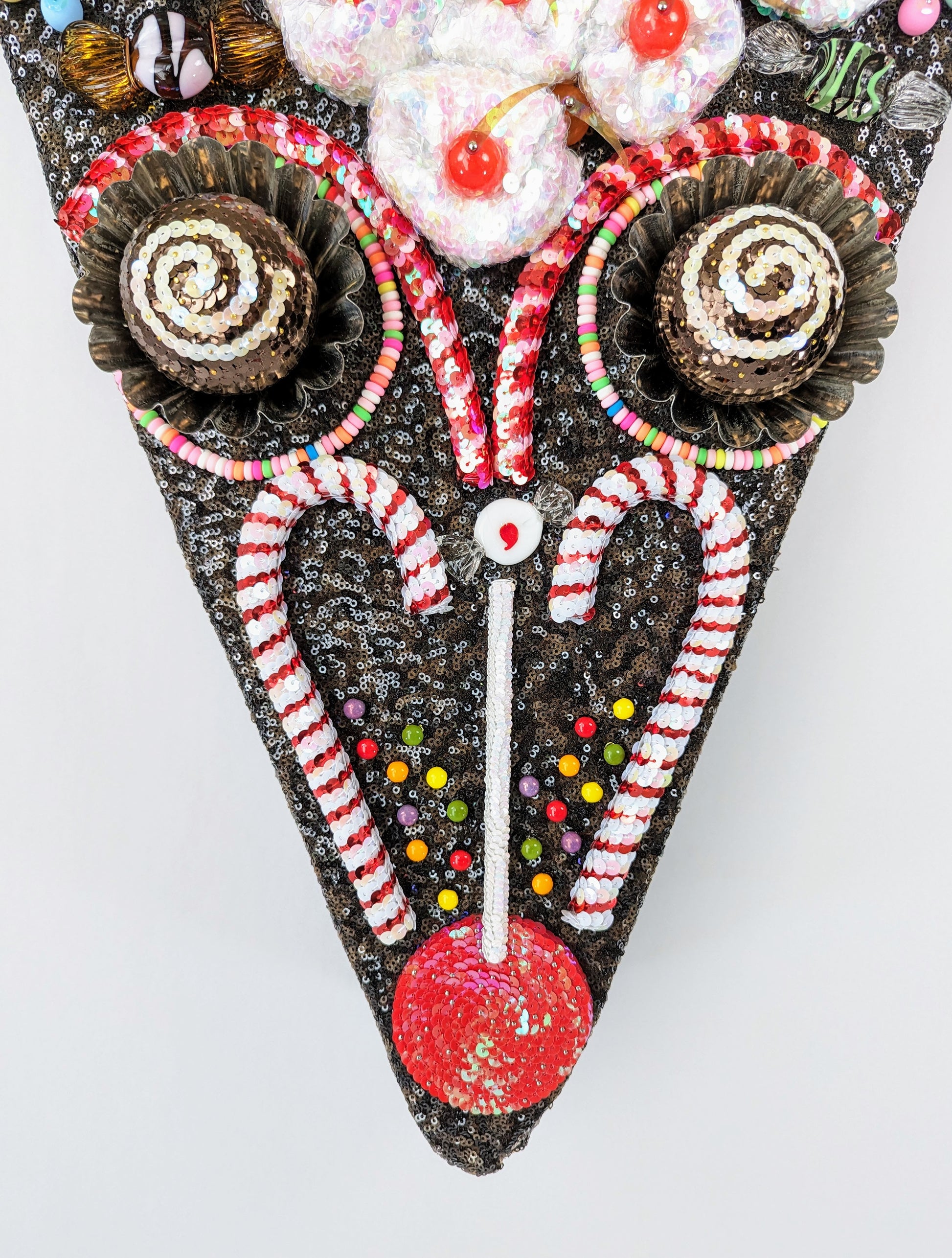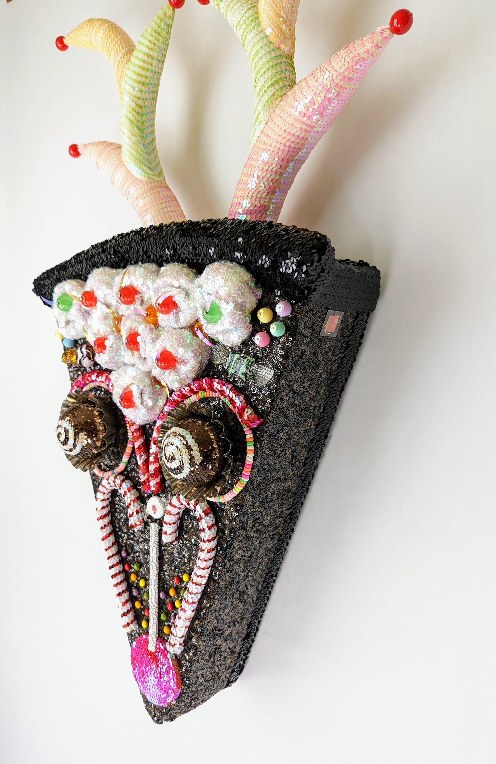 "Rudy" is a candy-themed deer head that also happens to be a slice of chocolate pie. The horns are wrapped in various candy-colored sequins and topped with red "cherry" beads. The nose is a red lollipop (hence, Rudy is named after Rudolph the Red Nosed Reindeer), and each eye is a chocolate truffle in fluted tins. There are various candy beads all over the face, and whipped cream puffs at the temple.