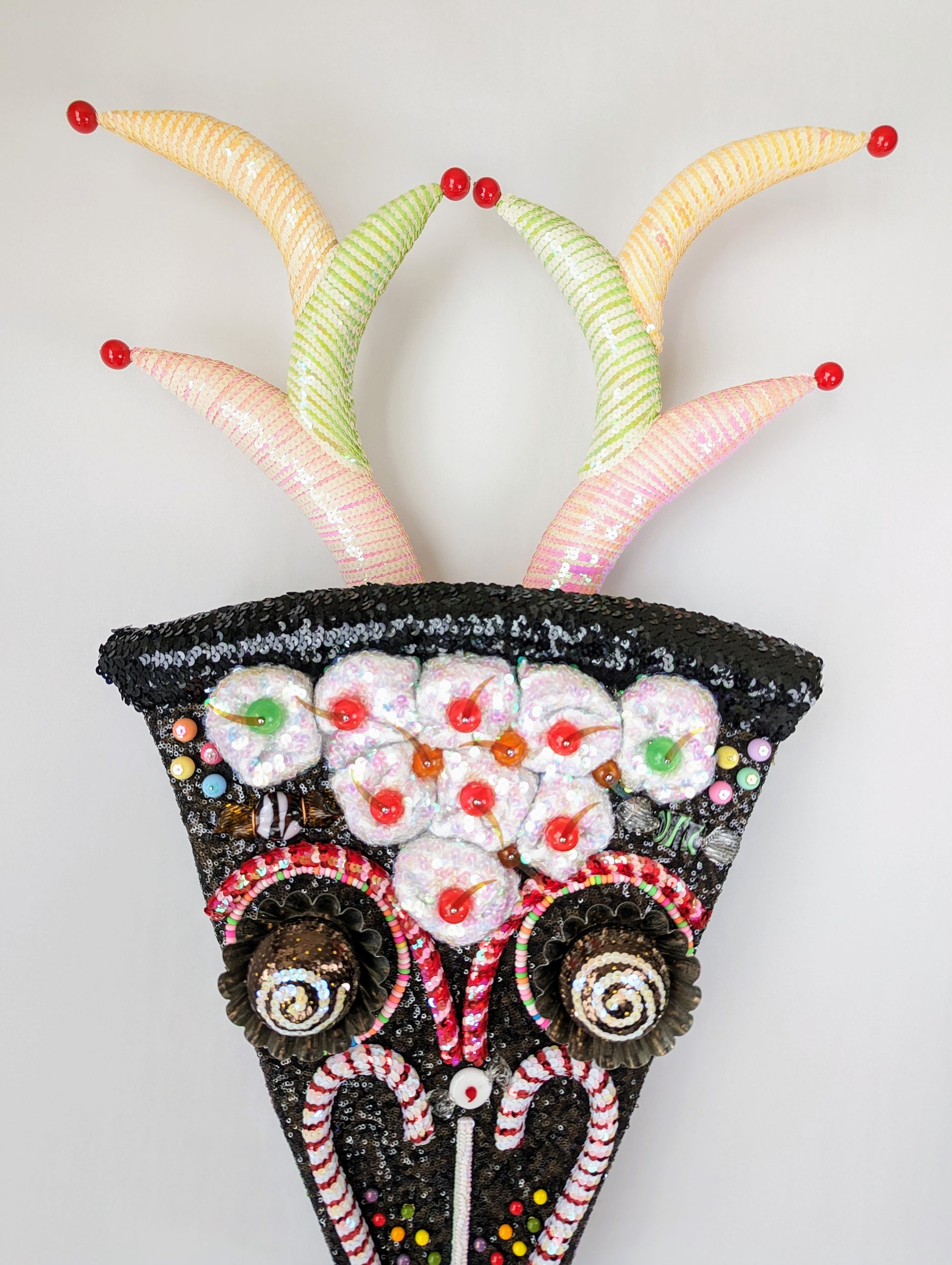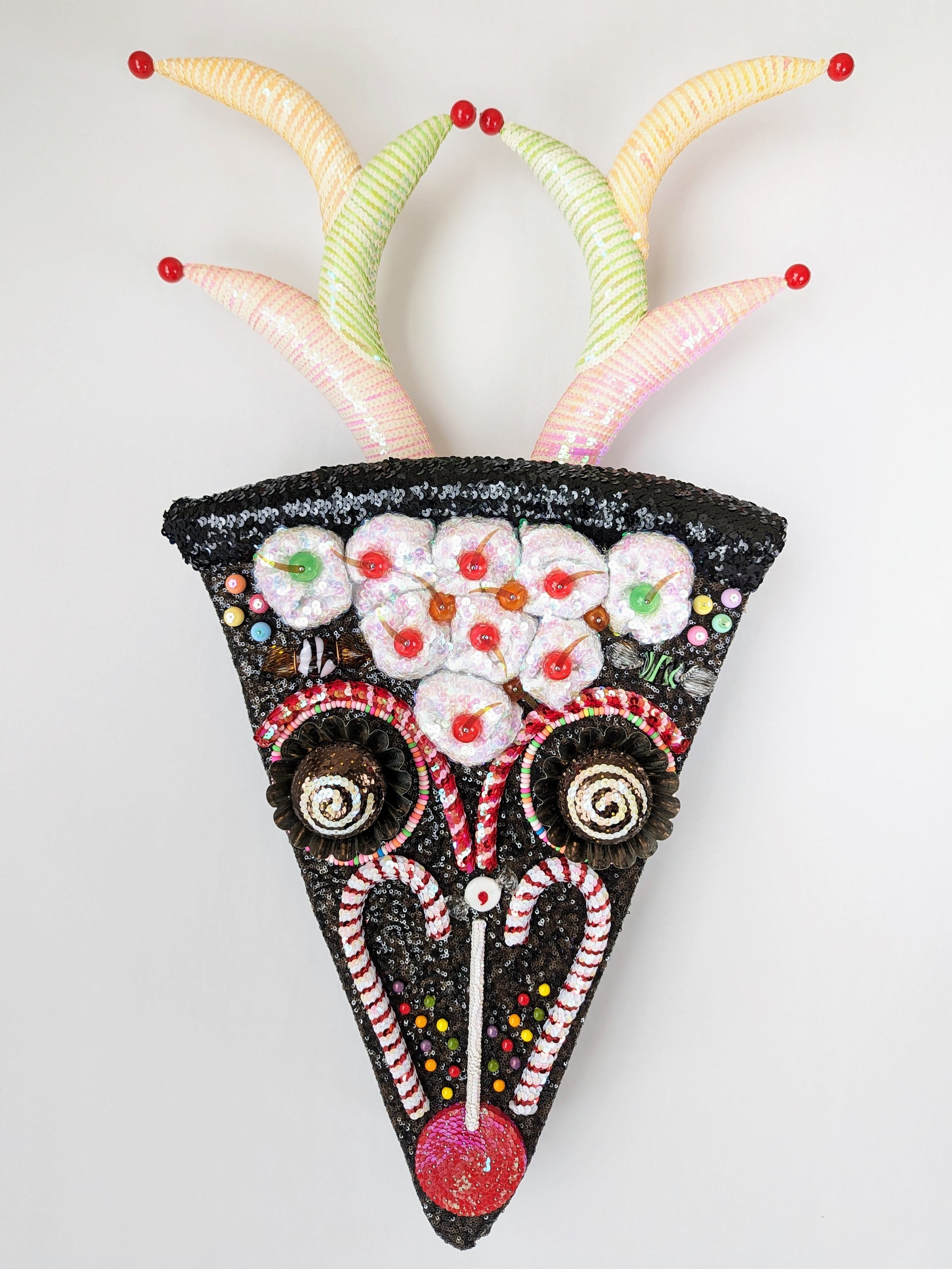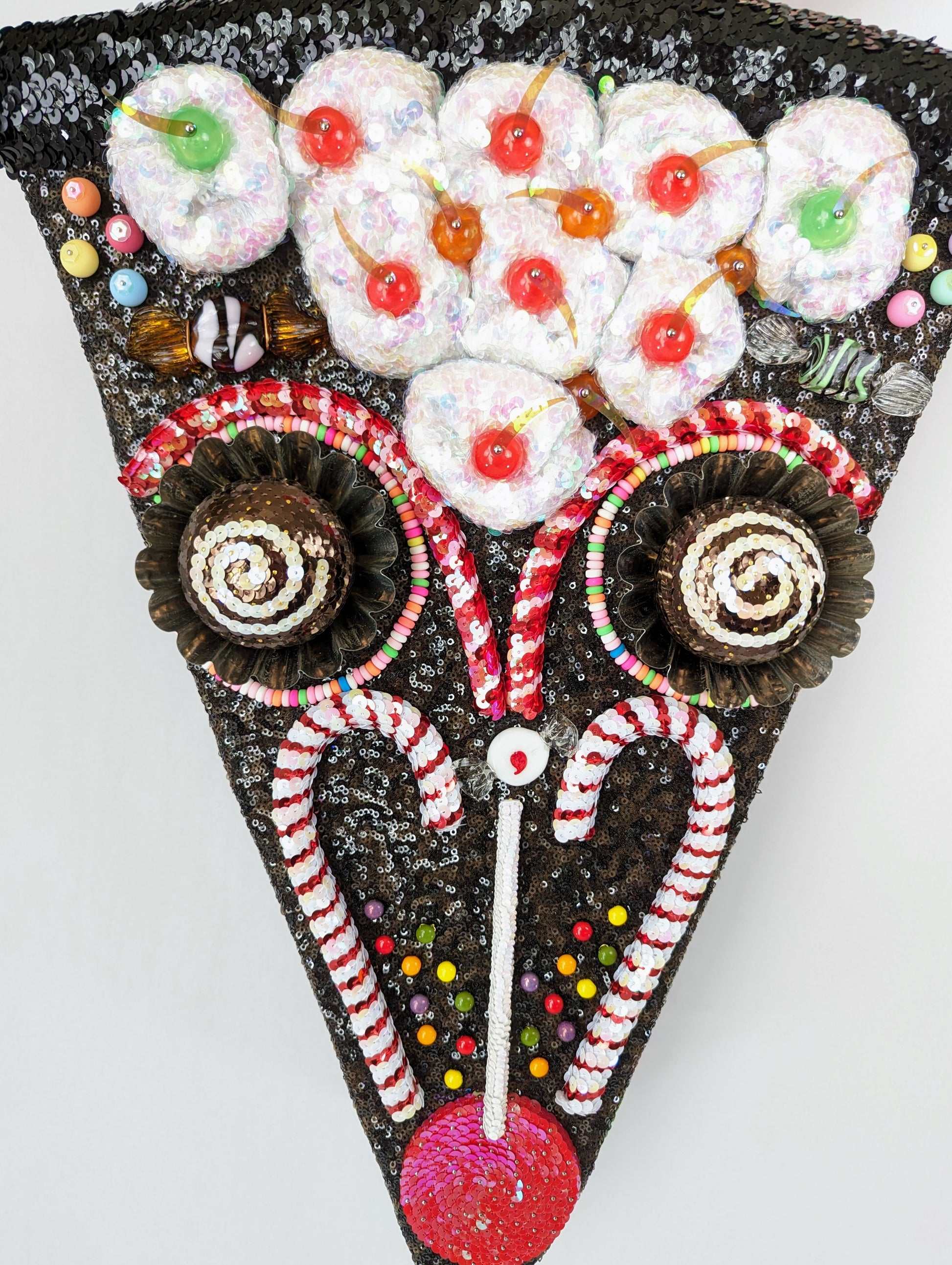 "Rudy" is a candy-themed deer head that also happens to be a slice of chocolate pie. The horns are wrapped in various candy-colored sequins and topped with red "cherry" beads. The nose is a red lollipop (hence, Rudy is named after Rudolph the Red Nosed Reindeer), and each eye is a chocolate truffle in fluted tins. There are various candy beads all over the face, and whipped cream puffs at the temple.