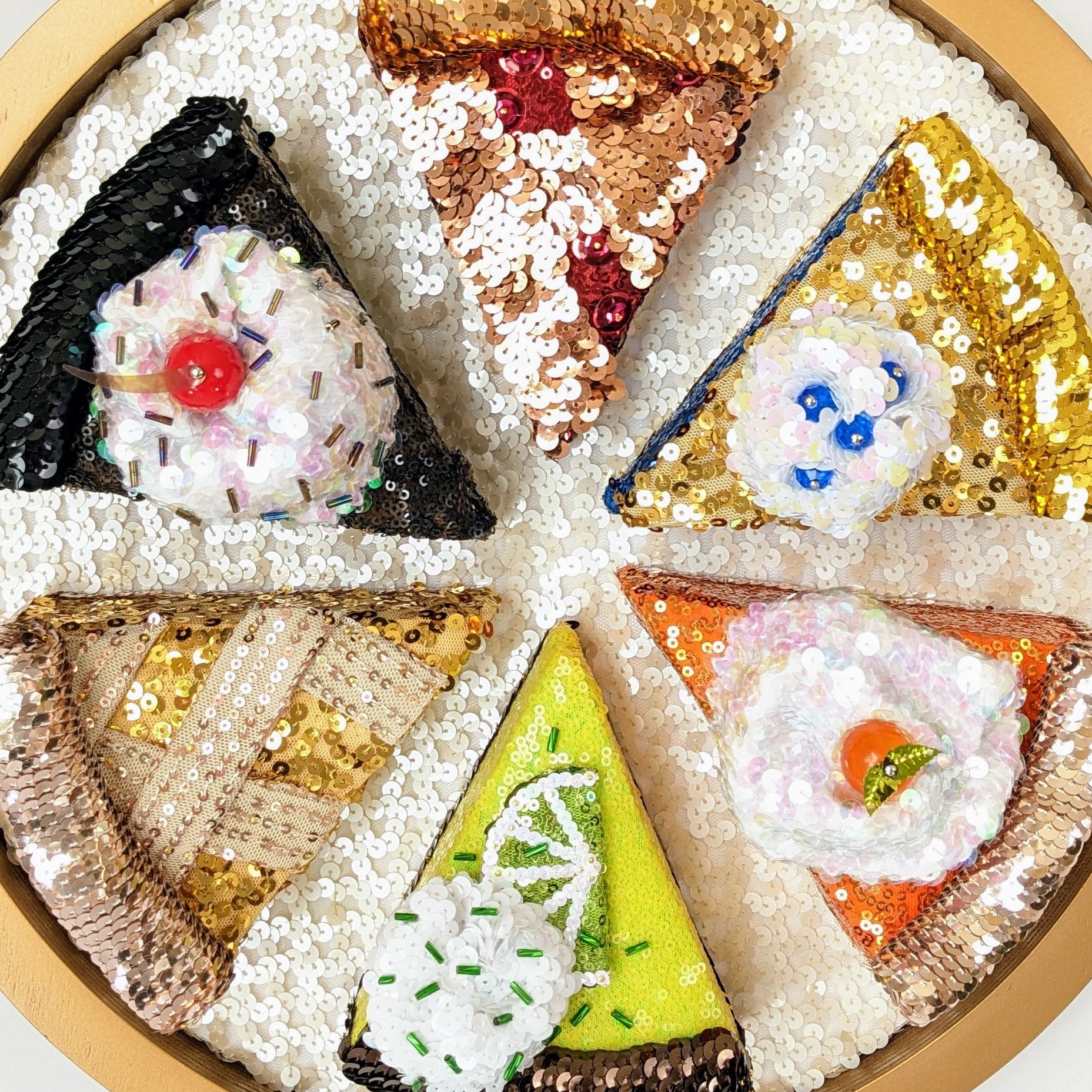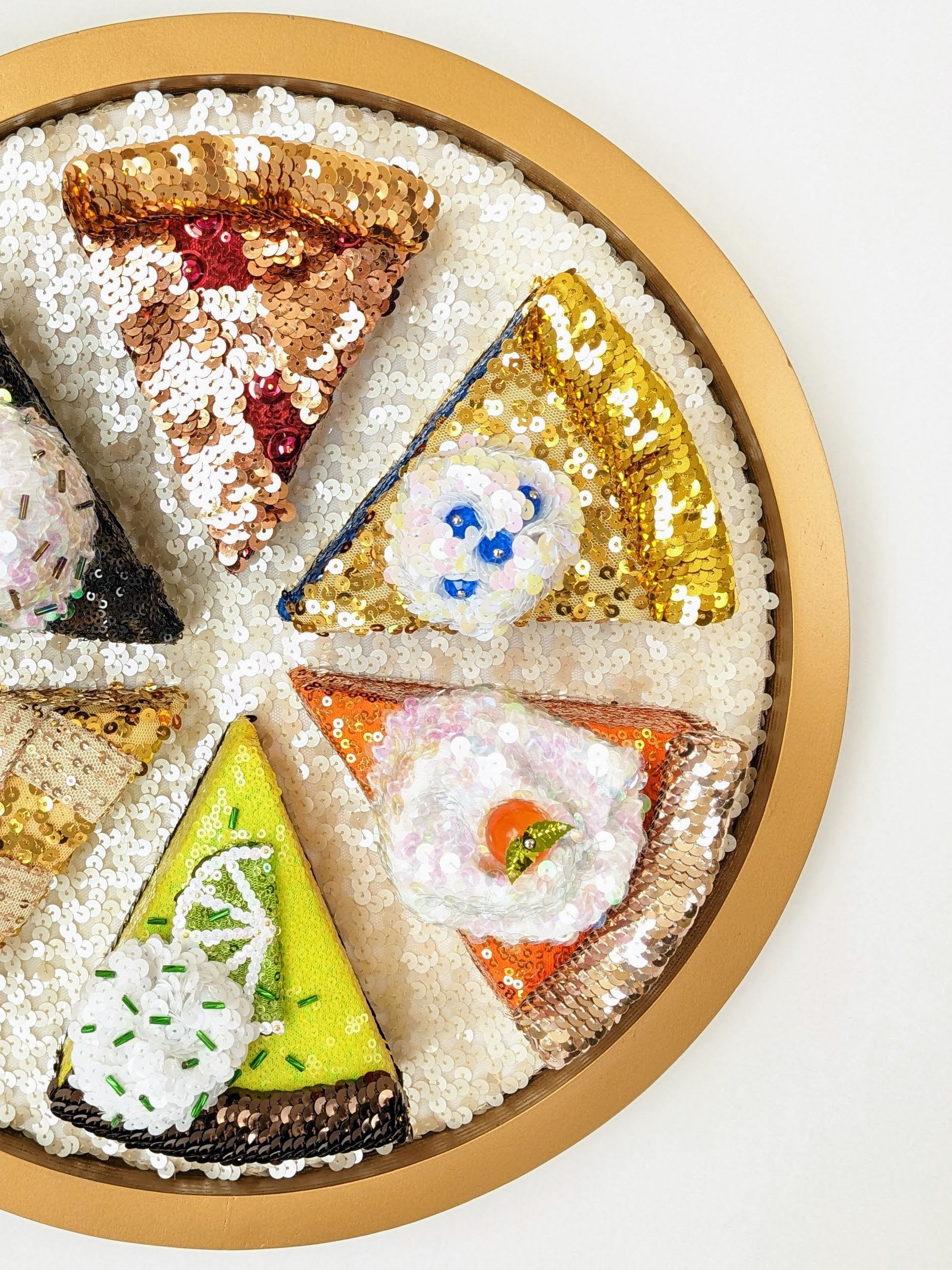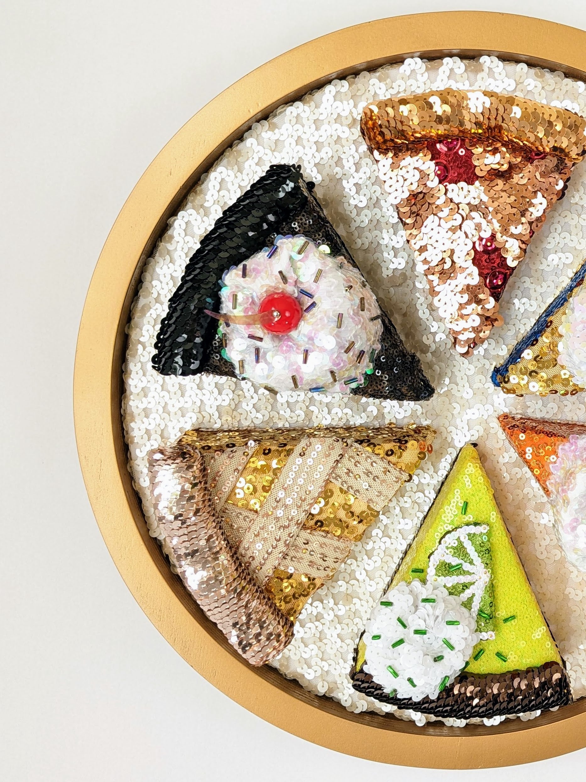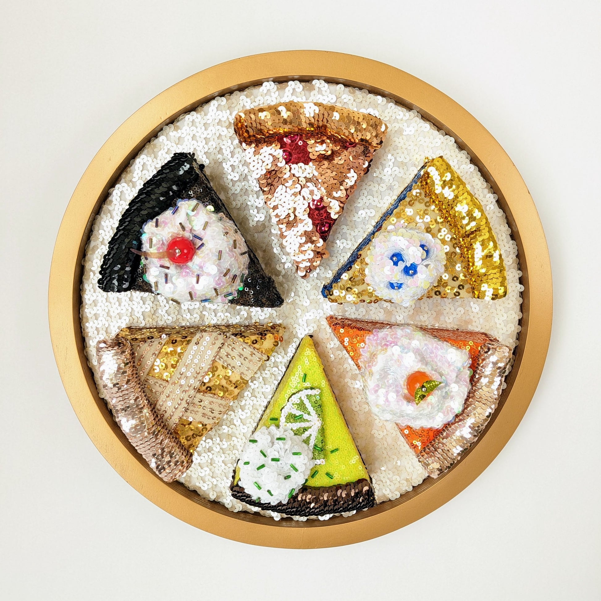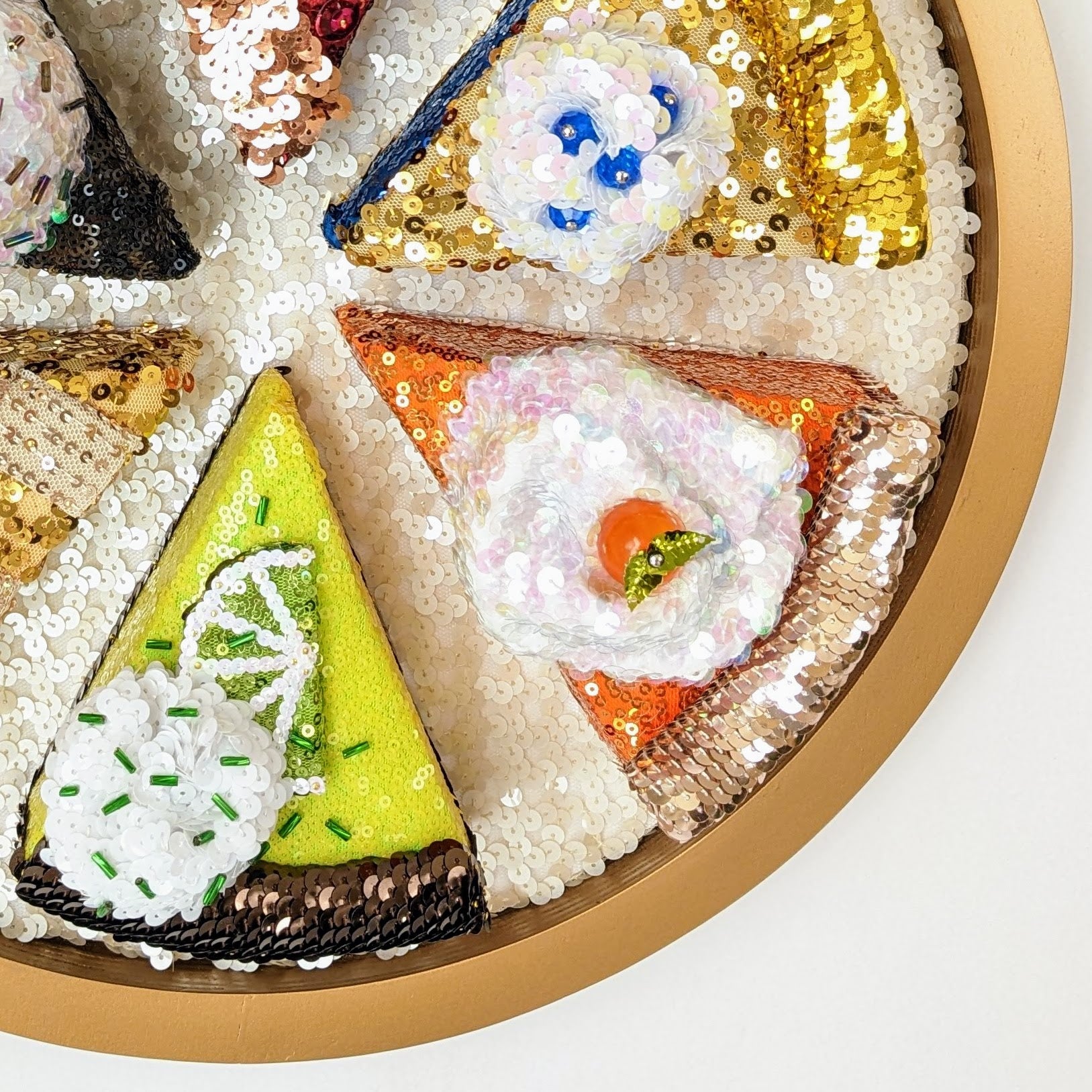A pretty pie platter featuring an assortment of favorites, including cherry, blueberry, pumpkin, key lime, apple, and chocolate. The background is a white sequin lattice mounted in a golden wood circle frame.
